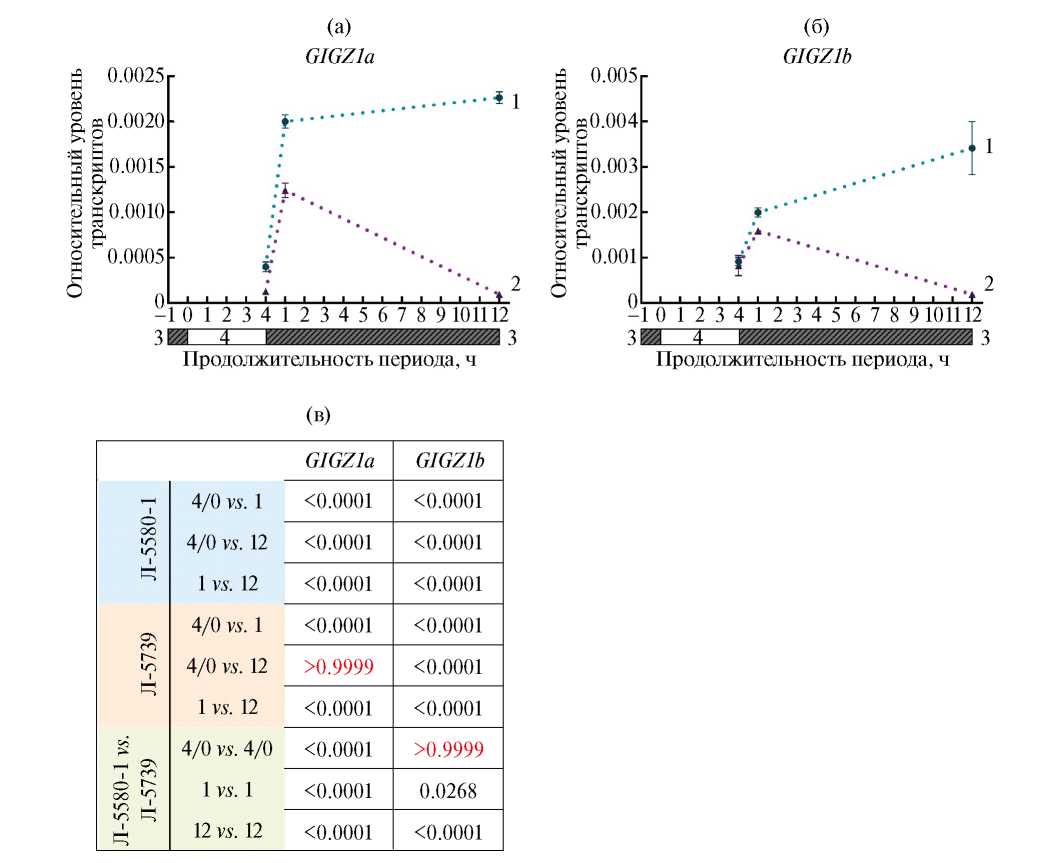 Несмотря на внешнее сходство линий, реакция на смену фотопериода различалась на молекулярном уровне. Так, у обеих линий наблюдался рост экспрессии генов циркадного цикла GIGZ1a и GIGZ1b спустя 1 ч после перехода в режим “темного дня”. Однако, к концу (12 ч) “темного дня” уровень транскриптов продолжал расти у Л-5580-1 и, напротив, стал снижаться у Л-5739 (рис. 1а, б). Как упоминалось выше, в норме (длинный фотопериод) мРНК GIGZ1a и GIGZ1b начинает накапливаться с рассвета, достигая к вечеру максимума, затем в течение ночи уровень транскриптов генов снижается до минимума [3]. При отмене ночи (постоянный день или “светлая ночь”) циркадный ритм сохраняется, однако падение уровня транскриптов GIGZ1a и GIGZ1b с наступлением “светлой ночи” происходит менее интенсивно, чем реальной темной ночью [3].