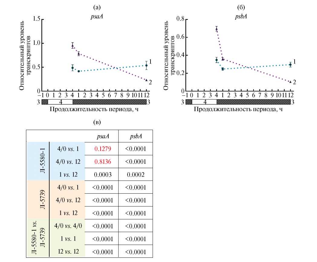 Действительно, линии значительно различались по исходному (“4/0”) уровню транскриптов psaA и psbA (рис. 2а, б). Снижение экспрессии генов у обеих линий через 1 ч после наступления “темного дня” (рис. 2а, б) соответствует темновой фазе фотосинтеза и находится в согласии с ранее показанным сокращением уровня транскриптов генов psaA и psbA к наступлению темноты [37]. Однако далее, к 12 ч “темного дня”, у Л-5580-1 уровень транскриптов psaA и psbA вырос (рис. 2а, б), как если бы это был день, что подтверждает сохранение циркадного цикла у данной линии. В то же время у Л-5739 активность генов напротив продолжила падать (рис. 2а, б), что соответствует ночному профилю экспрессии генов и, учитывая известную роль psaA и psbA в адаптации растения к изменениям в характеристиках света [11], может служить подтверждением повышенной адаптивности Л-5739 к смене фотопериода.