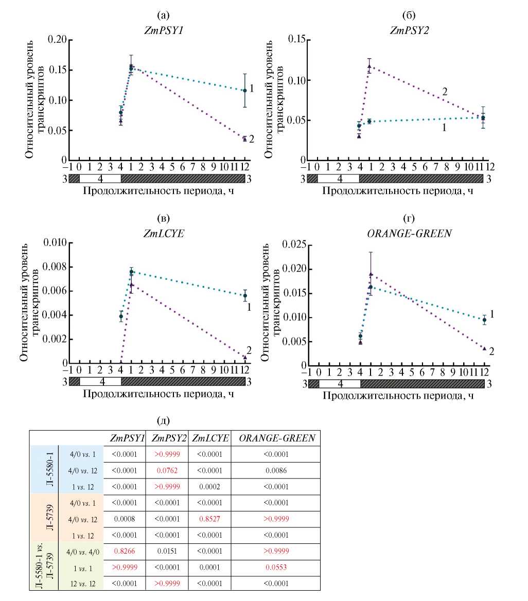 Рис. 3. Результаты РВ-ПЦР анализа профиля экспрессии генов ZmPSY1 (а), ZmPSY2 (б), ZmLCYE (в) и ORANGE-GREEN (г) в листьях проростков кукурузы (линии 5580-1 и 5739) в ответ на смену 16-часового фотопериода ультракоротким 4-часовым днем и 12-часовой ночью. Значения Р < 0.05 (д) соответствуют значимым различиям уровня транскриптов генов между точками замера (“4/0”, “1”, “12”) у каждой линии, а также в аналогичных точках между линиями. 1 – Л-5580-1, 2 – Л-5739, 3 – ночь, 4 – день.