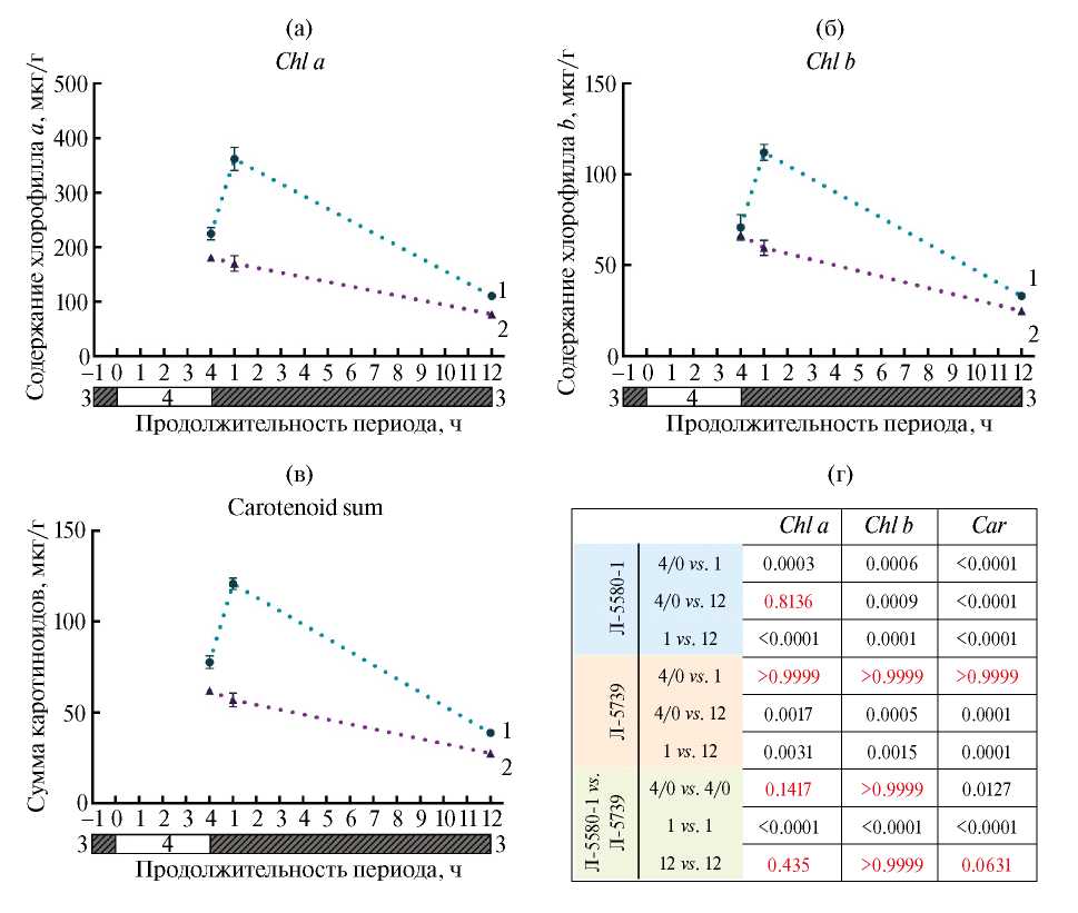 Биохимический анализ листовой ткани растений Л-5580-1 и Л-5739 показал, что содержание хлорофиллов a и b в исходной точке, сходное между линиями, в ответ на изменение фотопериода в точке “1” резко растет у Л-5580-1 и не меняется у Л-5739, а в точке “12” снижается у обеих линий до значений существенно ниже исходных (рис. 4а, б). Содержание суммы каротиноидов в точке “4/0” выше у Л-5580-1 в сравнении с Л-5739 и показывает сходную с хлорофиллами динамику реакции на смену фотопериода. А именно, в точке “1” количество каротиноидов существенно возрастает (в ~1.5 раза) в листьях Л-5580-1 и не меняется у Л-5739; в точке “12” сумма каротиноидов снижается у обеих линий до значений существенно ниже начальных (рис. 4в).