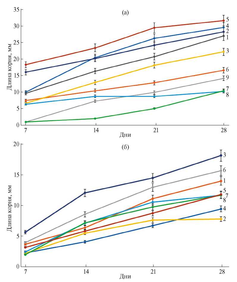 На безгормональных питательных средах обычные культуры корней пшеницы росли очень медленно и к 7 суткам переставали расти (рис. 1а). Из-за этого морфометрический анализ культур обычных корней пшеницы провести не удалось. В то же время зеленые корни пшеницы показывали довольно интенсивный и неограниченный по времени рост (рис. 1б). Рост зеленых корней при засолении замедлился в среднем в 1.5 раза, по сравнению с нормальными условиями (рис. 2). При нормальных условиях наибольшая длина и довольно интенсивный рост был характерен для линий 1, 4 и 5 (рис. 2а). Наибольшая скорость роста обнаруживалась у линий 1, 3, 4 и 9. Медленнее всего при нормальных условиях росли линии 6, 7 и 8 (рис. 2а). При действии NaCl лучше всего росли линии 1, 3 и 6 (рис. 2б). Худшие результаты показали зеленые корни линий 2 и 4 (рис. 2б).