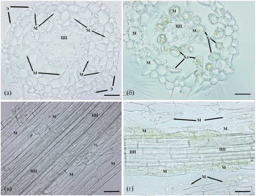 Рис. 3. Поперечный (а, б) и продольный (в, г) срезы обычных (а, в) и зеленых (б, г) корней мягкой пшеницы, растущих в условиях in vitro. ЦЦ – центральный цилиндр корня, М – паренхимные клетки мезофилла, Хл – паренхимные клетки корня с хлоропластами, Э – экзодерма. Увеличение ×160. Масштаб – 50 мкм.