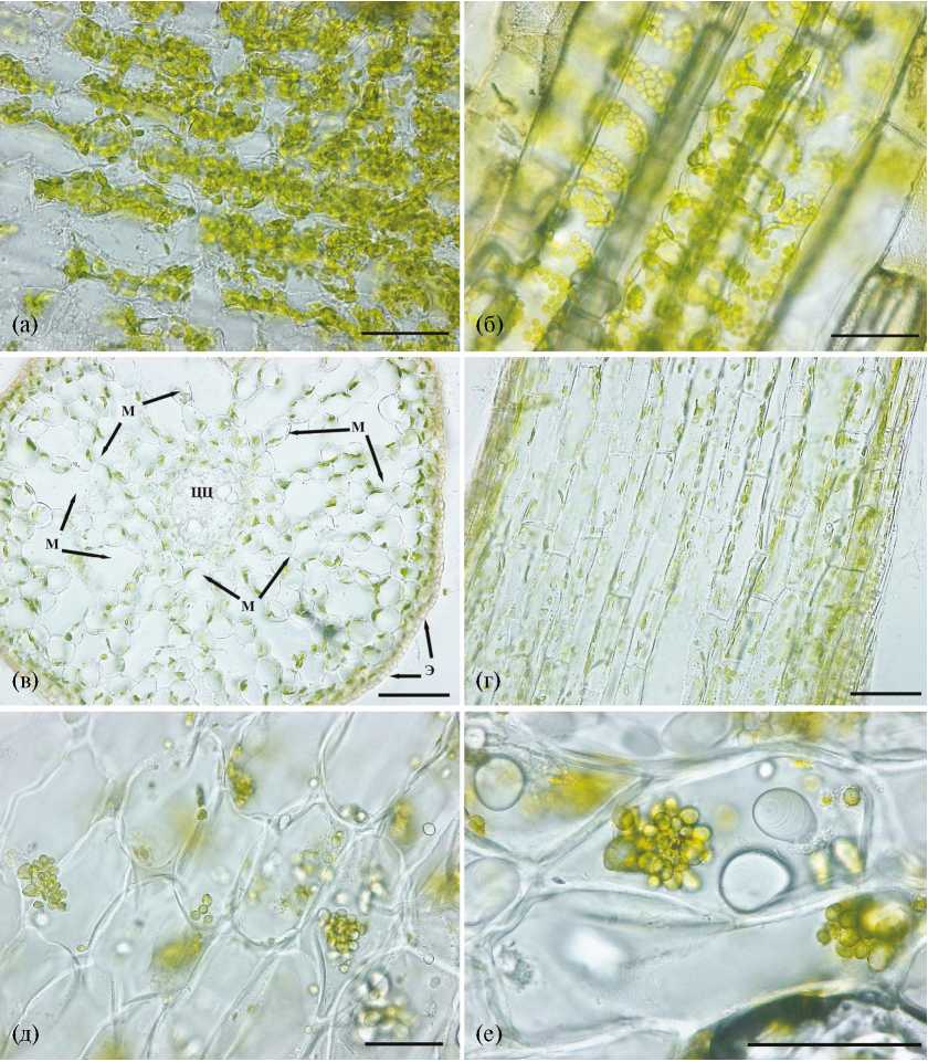 Рис. 4. Поперечный (а, б, в, д, е) и продольный (г) срезы листьев мягкой пшеницы (а, б), зеленых корней водяного ореха (в, г) и позеленевших клубней картофеля (д, е). ЦЦ – центральный цилиндр корня, М – паренхимные клетки мезофилла, Э – экзодерма. Увеличение ×160 (а–д), ×320 (е). Масштаб – 50 мкм.