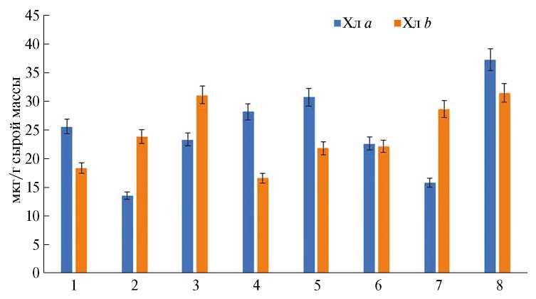 Рис. 5. Содержание хлорофиллов a и b в зеленых корнях мягкой пшеницы (линии 1–8).