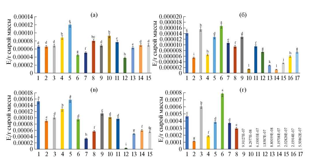 Рис. 7. Активность каталазы (а, б) и пероксидазы (в, г) в корнях пшеницы: а, в – при нормальных условиях (линии зеленых корней – 1–11, линии обычных корней – 12–15); б, г – при добавлении в МС-среду 100 мМ NaCl (линии зеленых корней – 1–8, линии обычных корней – 9–17).