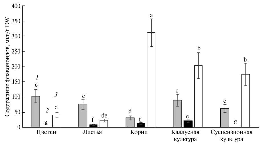Рис. 5. Содержание индивидуальных флавоноидов в органах цветущих растений Lychnis chalcedonica, культивируемых в природной популяции, и в длительной каллусной и суспензионной культурах корней. 1 – рутин; 2 – кверцетин; 3 – дигидрокверцетин. Одинаковыми латинскими буквами обозначены величины, различия между которыми не достоверны при P ≤ 0.05.