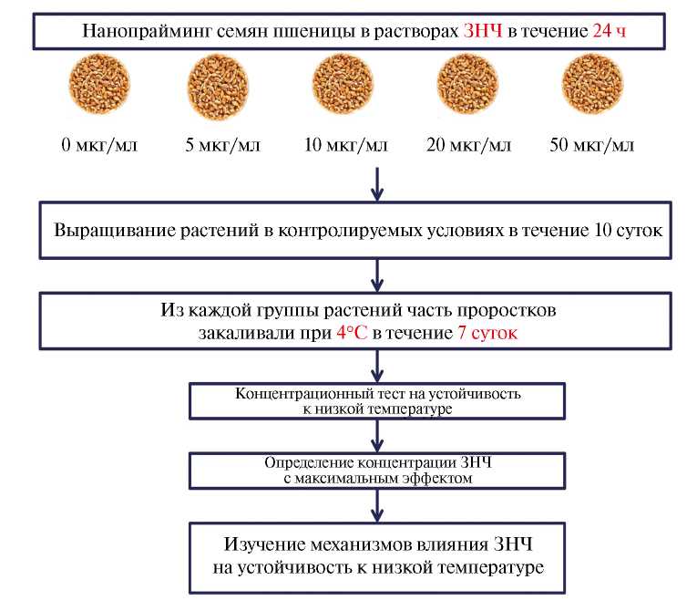 Схема эксперимента. Экспериментальная работа проводилась по следующей схеме (рис. 1). В качестве способа обработки растений растворами ЗНЧ мы выбрали нанопрайминг (замачивание семян) в течение 24 ч. Нанопрайминг считается простой, эффективной, рентабельной и экологически безопасной стратегией работы с НЧ [2]. Основываясь на литературных данных о том, что ЗНЧ в концентрациях до 50 мкг/мл чаще всего оказывают стимулирующий эффект на растительный организм [5, 14], мы использовали растворы с концентрациями ЗНЧ от 5 до 50 мкг/мл. После процедуры нанопрайминга семена проращивали в контролируемых условиях до достижения проростками возраста 10 сут. Затем часть растений из каждой группы отбирали и закаливали при температуре 4°С в течение 7 сут. Холодоустойчивость незакаленных и закаленных растений оценивали методом прямого промораживания. Основные физиолого-биохимические и молекулярно-генетические механизмы влияния ЗНЧ на растения пшеницы изучали, используя вариант с концентрацией ЗНЧ, показавший максимальный стимулирующий эффект на устойчивость к промораживанию.