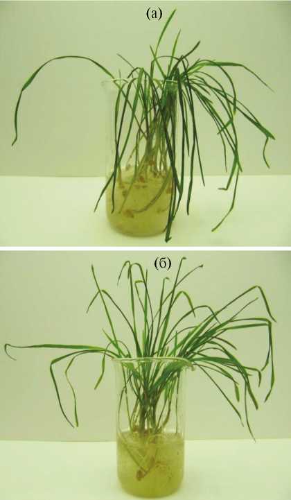 Рис. 3. Закаленные (4°С, 7 сут.) проростки пшеницы после промораживания при –5°С в течение 24 ч: а – контроль, б – проростки, обработанные ЗНЧ в концентрации 10 мкг/мл.