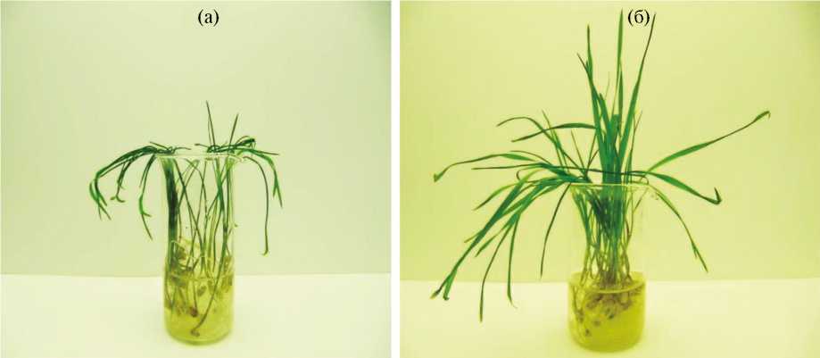 Рис. 2. Незакаленные проростки пшеницы после промораживания при температуре –3°С в течение 24 ч: а – контроль, б – проростки, обработанные ЗНЧ в концентрации 10 мкг/мл.