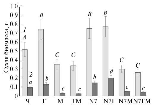 Рис. 2. Биомасса побегов (1) и корней (2) 3-недельных растений Sorghum bicolor в разных вариантах вегетационного опыта. Полосы погрешностей означают доверительный интервал, рассчитанный для n ≥ 5 при P ≤ 0.05; одинаковыми заглавными буквами отмечены значения веса побегов, достоверно не отличающиеся между собой; одинаковыми строчными буквами отмечены значения веса корней, достоверно не отличающиеся между собой при P ≤ 0.05. Ч – чистый вариант, Г – н-гексадекан, М – металл (Ni2+), N7 – бактерии Gordonia sp. N7.