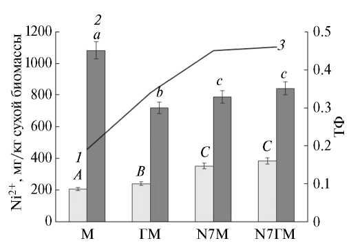 Рис. 3. Накопление ионов никеля в побегах (1) и корнях (2) Sorghum bicolor и ТФ никеля (3). Полосы погрешностей означают ошибку среднего значения, не превышающую 5% для n ≥ 5; одинаковыми заглавными буквами отмечены значения для побегов, достоверно не отличающиеся между собой; одинаковыми строчными буквами отмечены значения для корней, достоверно не отличающиеся между собой при P ≤ 0.05. Г – н-гексадекан, М – металл (Ni2+), N7 – бактерии Gordonia sp. N7.