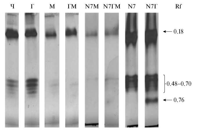 С помощью гель-электрофореза в неденатурирующих условиях установлено, что профиль пероксидаз в корневых экссудатах сорго был представлен как минимум двумя пероксидазами с Rf в диапазоне 0.18–0.70, одна из которых имела 5 изоформ (рис. 4). Обращает на себя внимание появление дополнительной пероксидазы с Rf 0.76 только в варианте N7Г – в случае совместного присутствия н-гексадекана и штамма. Влияние металла выражалось в снижении количества продуцируемых ферментов.