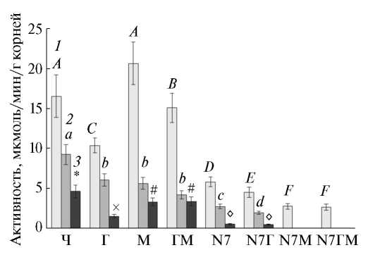 Рис. 5. Активность пероксидаз из корневых экссудатов Sorghum bicolor в отношении тестовых субстратов: 1 – ОДА; 2 – ДАФ; 3 – АБТС. Одинаковыми заглавными буквами отмечены значения для ОДА, достоверно не отличающиеся между собой; одинаковыми строчными буквами отмечены значения для ДАФ, достоверно не отличающиеся между собой; одинаковыми символами отмечены значения для АБТС, достоверно не отличающиеся между собой при P ≤ 0.05. Ч – чистый вариант, Г – н-гексадекан, М – металл (Ni2+), N7 – бактерии Gordonia sp. N7.