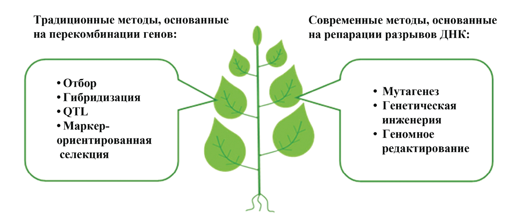 Традиционные методы селекции, основанные на перекомбинации генов. Рассматривая ретроспективно основные этапы исследований, направленных на улучшение хозяйственно-ценных признаков у растений, используемых человеком для своих целей, условно разделим применяемые для этого методы и подходы на две группы. Согласно схеме, представленной на рис. 1, к первой группе отнесены методы, основанные на использовании природного разнообразия и выявления спонтанных мутаций, где роль исследователя или селекционера определяется искусством их обнаружения, поддержания и закрепления в новом создаваемом сорте. Ко второй группе условно отнесем методы, основанные на внесении в геномную ДНК улучшаемых видов растений повреждений с последующим их восстановлением системами клеточной репарации, т. е. внесением в геном растения искусственных мутаций, индуцированных исследователем. Такое деление методов, используемых человеком для улучшения хозяйственно-ценных характеристик возделываемых видов растений, в рамках данного обзора нацелено на более глубокое понимание при обсуждении в дальнейшем как преимуществ, так и степени возможных рисков при внесении генетических модификаций для человека и окружающей среды.