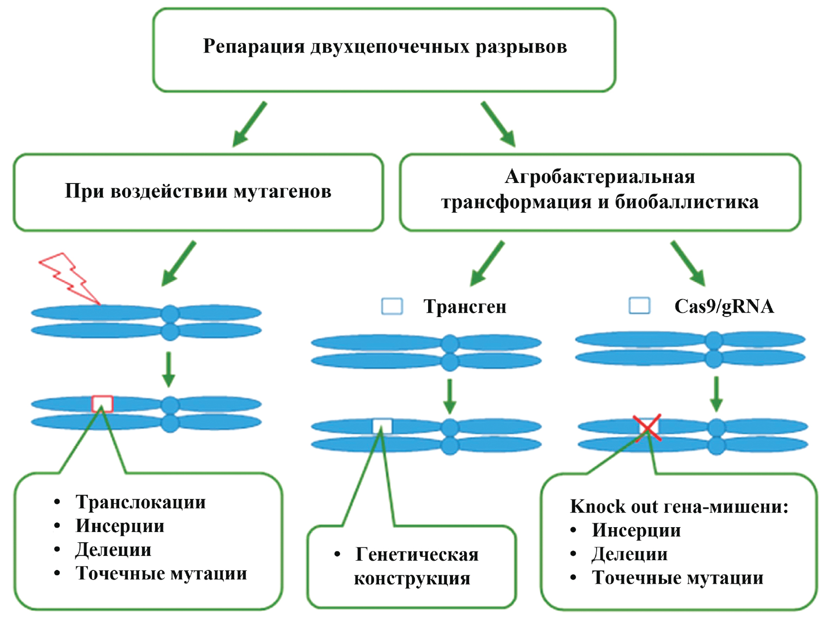 Рис. 2. Схема нарушений в геномной ДНК растений под воздействием мутагенов и Т-ДНК-инсерций при агробактериальной трансформации и биобаллистики.