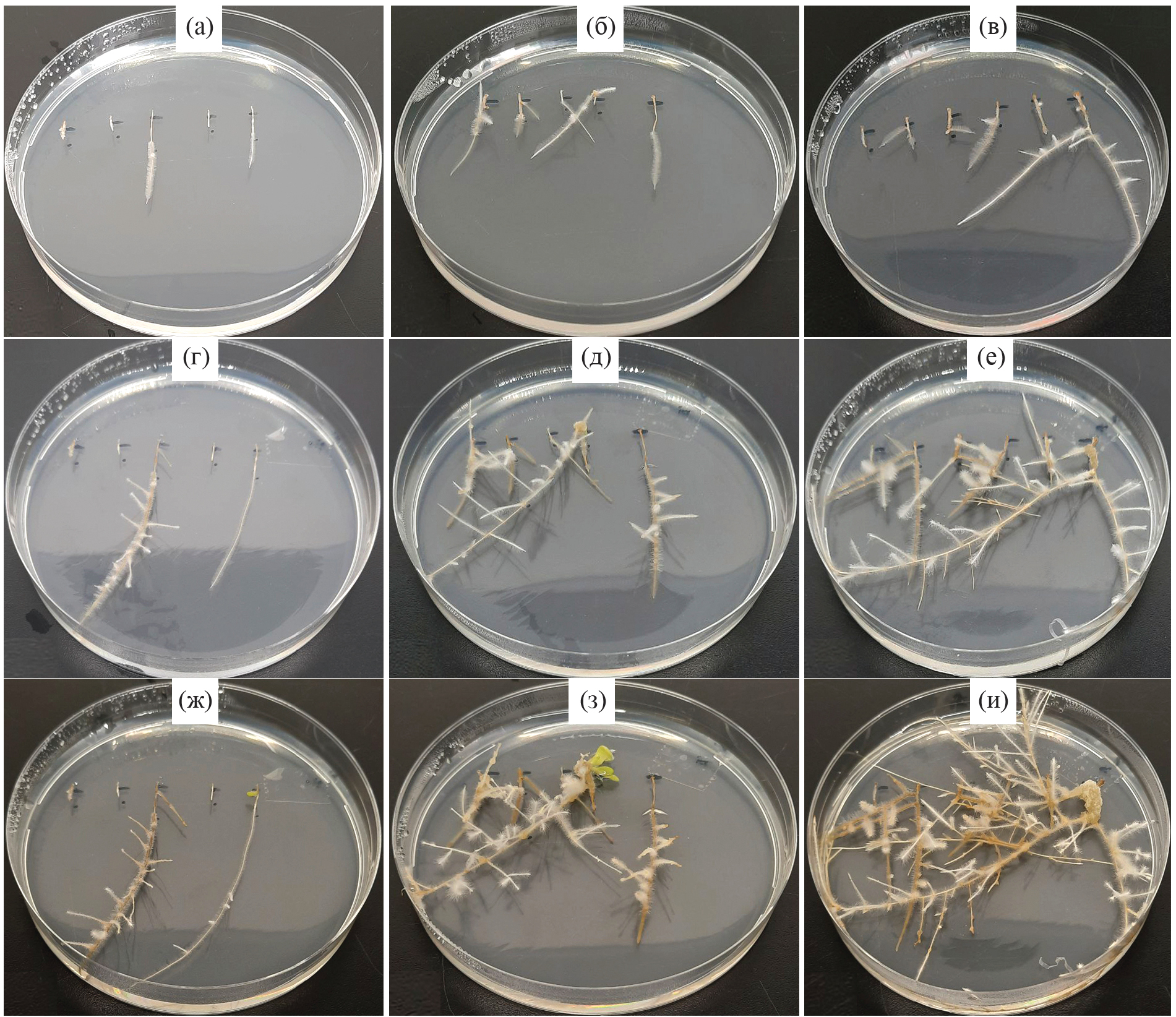 Рис. 2. Внешний вид исследуемых ВК при действии 150 мМ NaCl: контрольные ВК без гена TaNAC69 через 10 (а), 20 (г) и 30 (ж) сут. после начала опыта; трансгенные ВК с геном TaNAC69 линии 21 через 10 (б), 20 (д) и 30 (з) сут. после начала опыта; трансгенные ВК с геном TaNAC69 линии 22 через 10 (в), 20 (е) и 30 (и) сут. после начала опыта. В работе использованы чашки Петри диаметром 10 см.