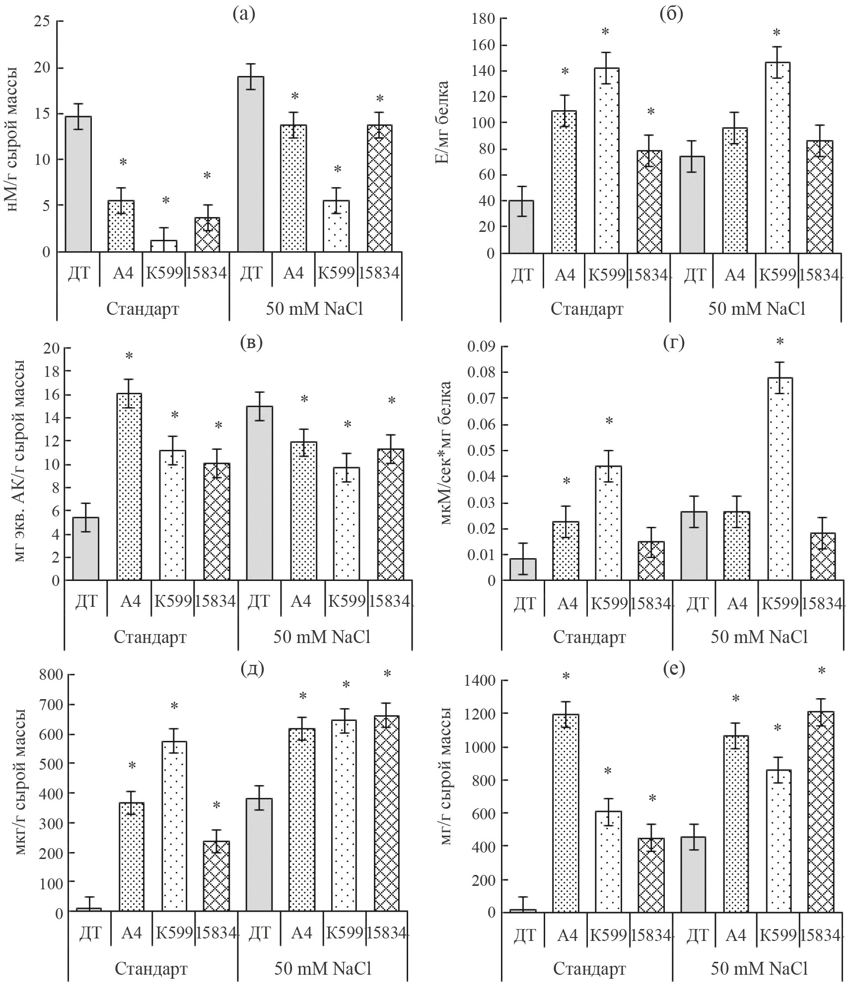 Активность ГПОК (рис. 5д) в корнях всех трансгенных линий в нормальных условиях была выше, чем у растений ДТ в среднем в растениях А4 – в 2.9 раза, 15834 – в 2.5 раза и К599 – в 6.5 раза. При засолении активность ГПОК в корнях растений линий А4 и 15834 достоверно снижалась в среднем в 1.3 и 1.8 раза соответственно, и была ниже по сравнению с ДТ у линий А4 – в 1.7 раза и 15834 – в 2.8 раза, а в корнях растений линий К599 повысилась в среднем в 1.2 раза, превысив значение ДТ в среднем в 1.9 раза.