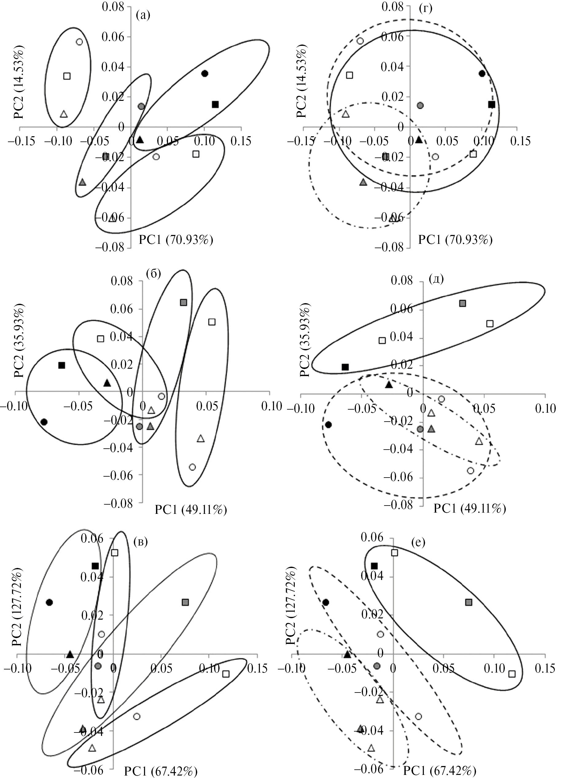 Рис. 1. Ординация 36 образцов фрагментов почек берез: – B. pubescens, – B. pendula, – B. pendula var. сarelica. Эллипсы а–в группируют фазы распускания; г–е – виды берез. Фазы распускания: I – белый, II – серый, III – светло-серый, IV – черный, а, г – РС 1 (70.93% дисперсии) коррелировал с влажностью (r = 0.87), содержанием СЛ (r = 0.36); РС 2 (14.53% дисперсии) коррелировал с содержанием НЛ (r = 0.55) и ГЛ (r = 0.75); б, д – РС 1 (49.11% дисперсии) коррелировал с влажностью (r = 0.72), содержанием СЛ (r = 0.35) и ГЛ (r = 0.57); РС 2 (35.93% дисперсии) коррелировал с содержанием СЛ (r = 0.69) и НЛ (r = 0.59); в, ж – РС 1 (67.42% дисперсии) коррелировал с содержанием СЛ (r = 0.72), содержанием НЛ (r = 0.50) и ГЛ (r = 0.43); РС 2 (27.72% дисперсии) коррелировал с влажностью (r = 0.71), содержанием НЛ (r = 0.47) и ГЛ (r = 0.50).