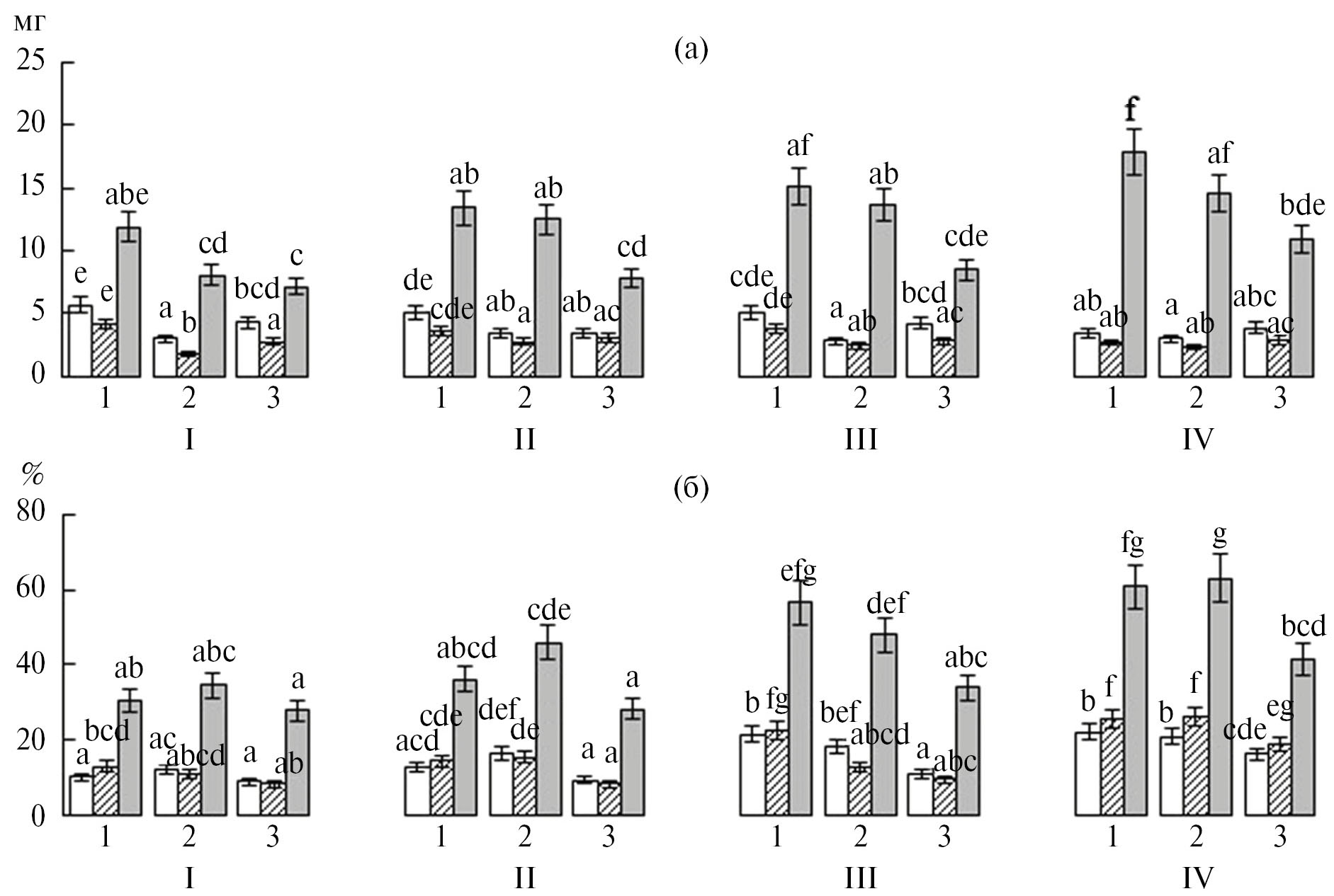 Рис. 2. Сухая масса (а) и влажность (б) фрагментов одной почки разных видов и формы Betula: (1) B. pubescens, (2) B. pendula, (3) B. pendula var. carelica. Белый, штриховка, серый – чешуи, прилистники, листочки соответственно. I–IV – фазы распускания. Сравнения проводили для каждого фрагмента по фазам распускания и по видам березы. Каждое значение представляет среднее из трех биологических повторностей и их стандартное отклонение. Разными латинскими буквами обозначены статистические различия (HSD-тест Тьюки, P < 0.05).