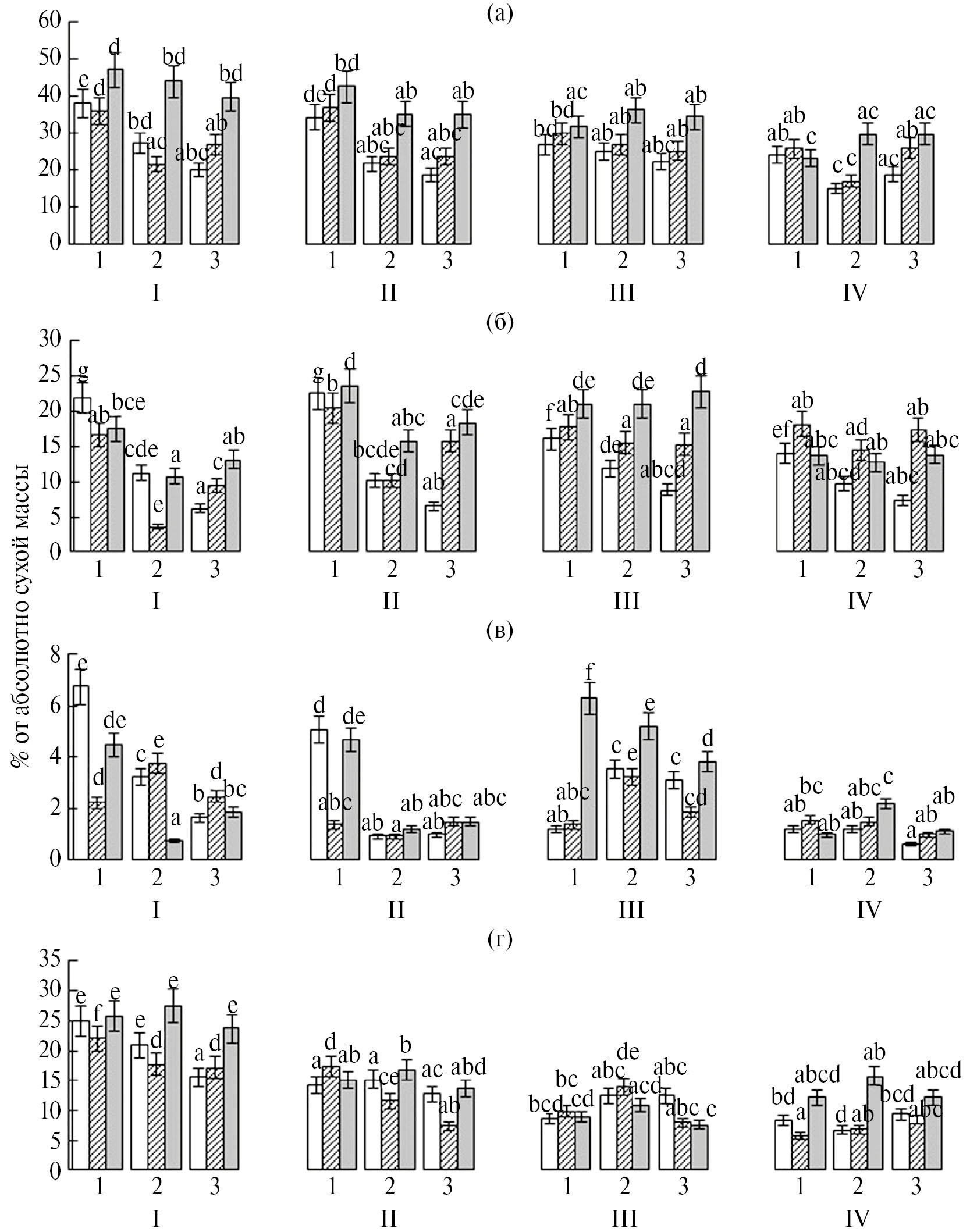 Рис. 3. Содержание суммарных липидов (а), нейтральных липидов (б), фосфолипидов (в) и гликолипидов (г) фрагментов почек разных видов и формы Betula: (1) B. pubescens, (2) B. pendula, (3) B. pendula var. carelica. Белый, штриховка, серый – чешуи, прилистники, листочки соответственно. I–IV – фазы распускания. Сравнения проводили для каждого фрагмента по фазам распускания и по видам березы. Каждое значение представляет среднее из трех биологических повторностей и их стандартное отклонение. Разными латинскими буквами обозначены статистические различия (HSD-тест Тьюки, P < 0.05).