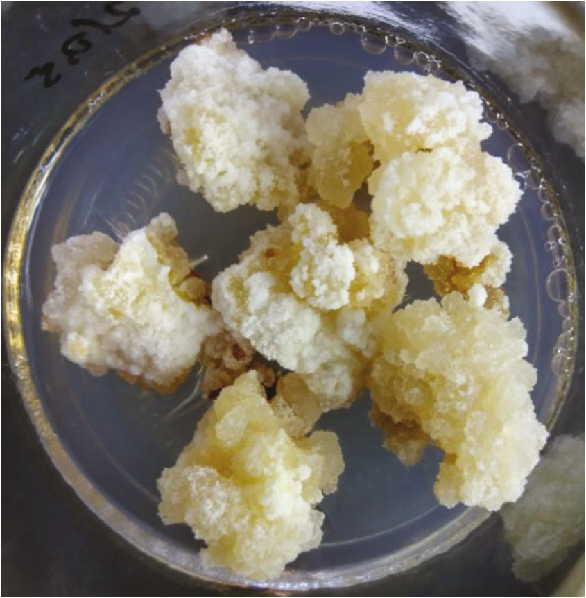 Каллусная культура была получена только на эксплантах, представляющих собой основание побега: при использовании листовых эксплантов наблюдали потемнение ткани, тогда как на корнях образование каллуса сменялось разрастанием корней. Полученная каллусная культура клеток имела светло-желтый цвет и рыхлую структуру.
