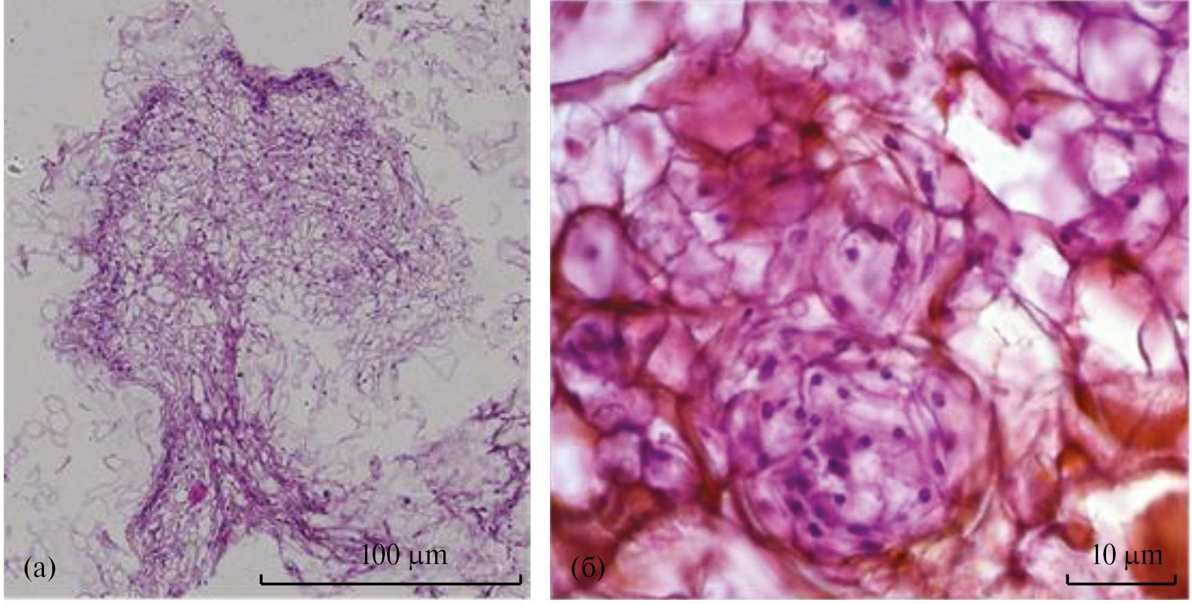 На гистологическом срезе основную часть каллуса составляли паренхимоподобные клетки, тогда как меристемоподобные клетки были локализованы небольшими скоплениями по краям с образованием редких морфологических очагов внутри каллуса. При этом внутри каллуса отмечено наличие больших каверн – пустот. При рассмотрении среза каллусной ткани можно наблюдать различные уплотнения и возникновение морфологических структур, представленных двумя зонами клеток: центральной – состоящей из относительно мелких, слабо вакуолизированных клеток, сохраняющих пролиферативную активность, и периферической – зоной крупных, рыхло расположенных сильно вакуолизированных паренхимоподобных клеток (рис. 2б). Таким образом, в соответствии с классификацией Кругловой с соавт. [14] у полученной культуры наблюдается становление гистологической зональности строения каллуса и гетерогенности его клеток по форме, размерам и строению.