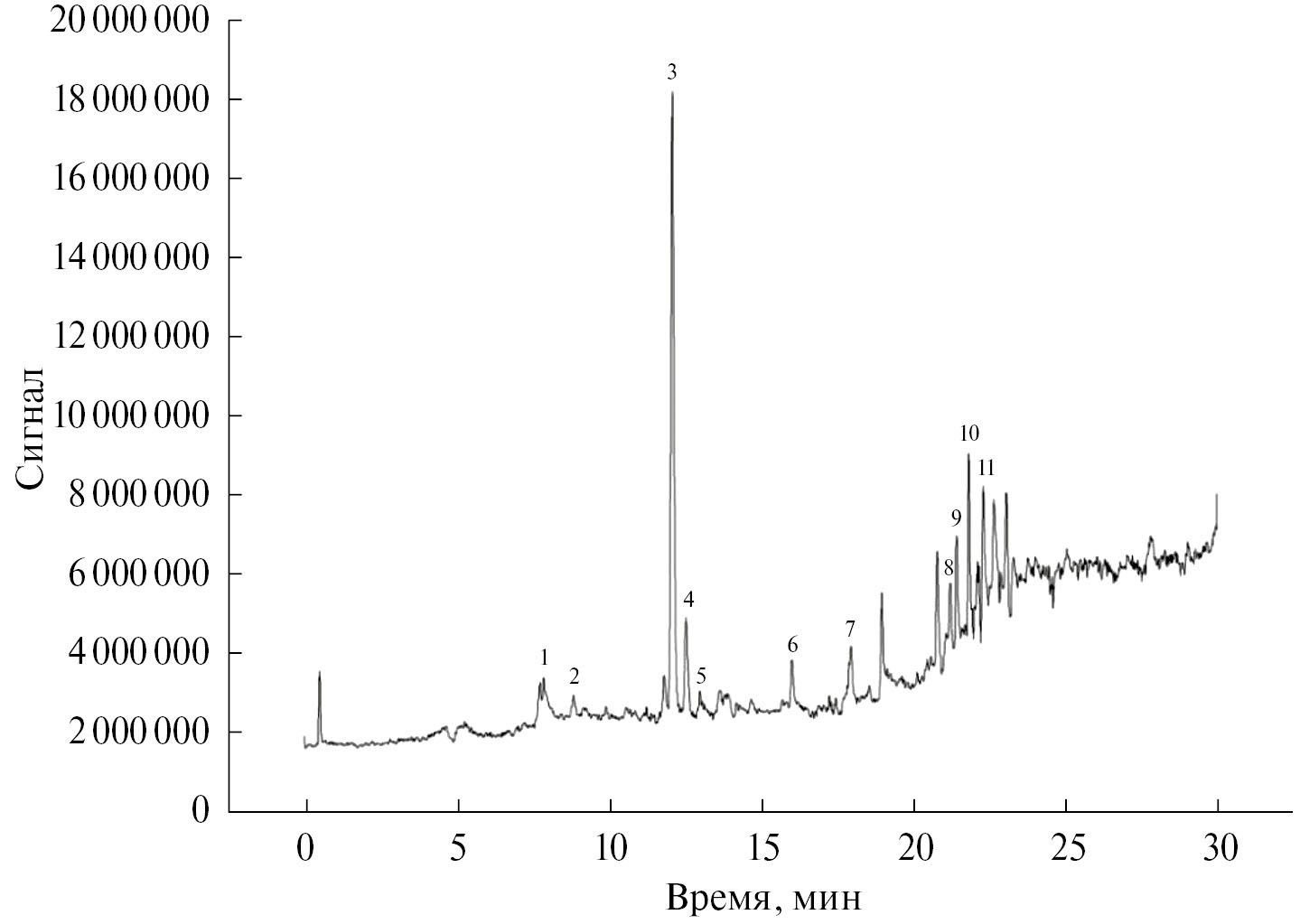 Рис. 3. ВЭЖХ-МС хроматограмма по полному ионному току хлороформно-бутанольной фракции из каллусной ткани копеечника альпийского. 1 – галловая кислота; 2 – ононин; 3 – формононетин; 4 – хедизариумкуместан B; 5 – диосметин; 6 – эпигалокатехин; 7 – изорамнетин; 8 – хедизариумкуместан А; 9 – эллаговая кислота; 10 – генистеин; 11 – веститол.