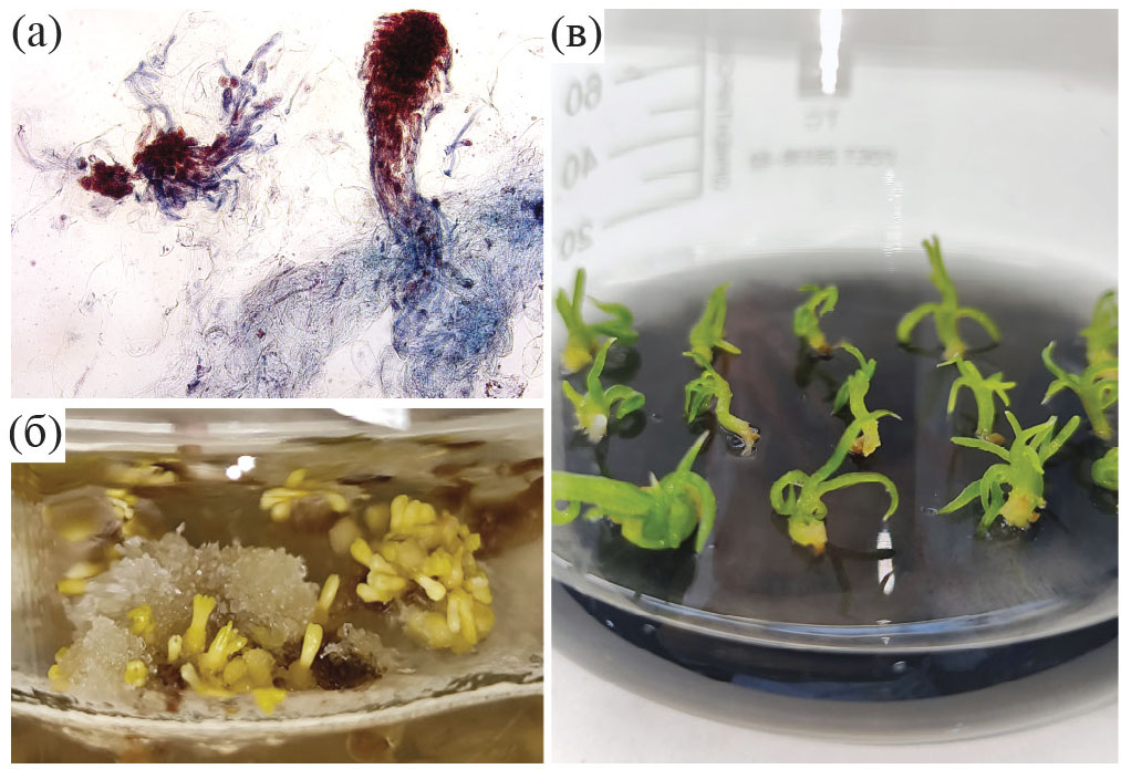Рис. 2. Соматические зародыши (СЗ) лиственницы сибирской (КЛ22.27.1) на разных стадиях онтогенеза: (а) – глобулярные СЗ на среде для пролиферации, (б) – дифференцированные семядольные СЗ на среде для созревания, (в) – 14-дневные регенеранты на среде для проращивания.
