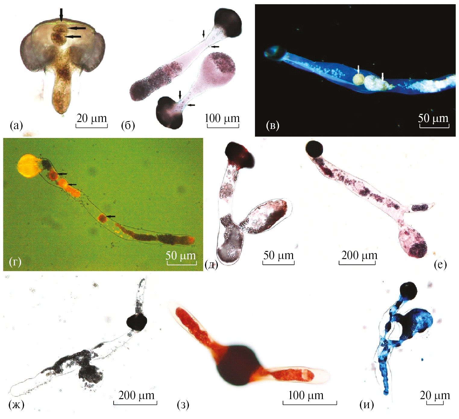 При проращивании пыльцы ели in vitro наблюдались случаи как простого дихотомического ветвления, так и биполярный рост пыльцевых трубок [37, 38]. Примеры ветвления, биполярного роста и тератологии пыльцевых трубок у ели показаны на рис. 4д, е, ж, з, и. При проращивании пыльцы на сахаросодержащей среде избыток гидролизованной глюкозы депонируется в форме крахмала в амилопластах, которые могут занимать значительный объем пыльцевой трубки (кроме самого кончика).