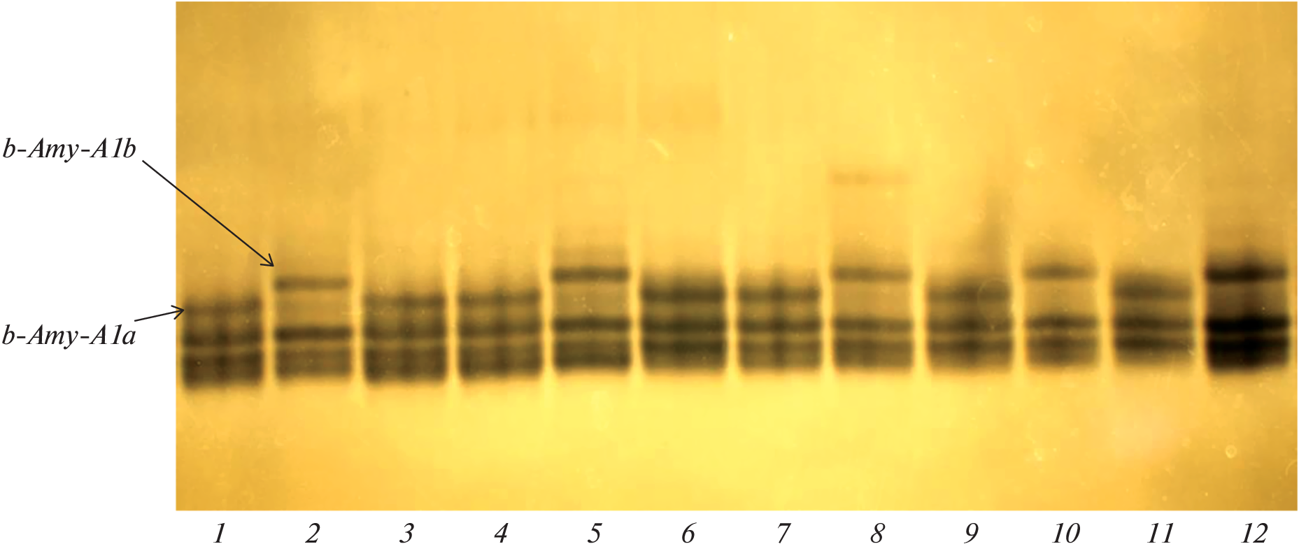 The analysis of the chromosomal location of the b-Amy-A1 gene, which controls the synthesis of wheat beta-amylase isoenzymes, was carried out by assessing the linkage with the B1 (Awnless) marker gene located in the long arm of chromosome 5A. Results based on F2 and F→∞ Delta × Selection 2092 study. The b-Amy-A1 locus showed 6.55 ± 2.10% linkage to the B1 gene. In parallel, alleles of the Rht8 locus, which causes dwarfing of plants, were identified and its linkage to the C gene (Compact spike) was established in 22.59 ± 6.28% (F2) and 24.22 ± 1.18% (F→∞) of recombination in chromosome 2D. The Delta variety carries the Rht8a allele, and the Selection 2092 accession carries the Rht8c allele. A collection of winter common wheat varieties created and released in the Russia was studied. The selected cultivars carried identical b-Amy-B1a and b-Amy-D1a alleles of the 4B and 4D chromosome loci. At the same time, the most common b-Amy-A1a and b-Amy-A1b alleles of chromosome 5A differed. It was found that in the direction from south to north of European part, the frequency of the b-Amy-A1a allele increases from 24.2% (Northern Caucasus) to 72.50% (Moscow–Ulyanovsk regions). Accordingly, the frequency of the alternative allele b-Amy-A1b decreased from 75.8% (Northern Caucasus) to 25.0% (Moscow–Ulyanovsk regions). In the Rostov region, the ratio of the occurrence of alleles b-Amy-A1a to b-Amy-A1b was 42.5 to 57.5%. At the same time, already in the Central Chernozem region+, a significant dominance of the b-Amy-A1a allele over b-Amy-A1b was manifested. Using the collection of varieties as a population of F→∞ demonstrated the linkage of b-Amy-A1 with B1 value in 5.56 ± 1.90% recombination.