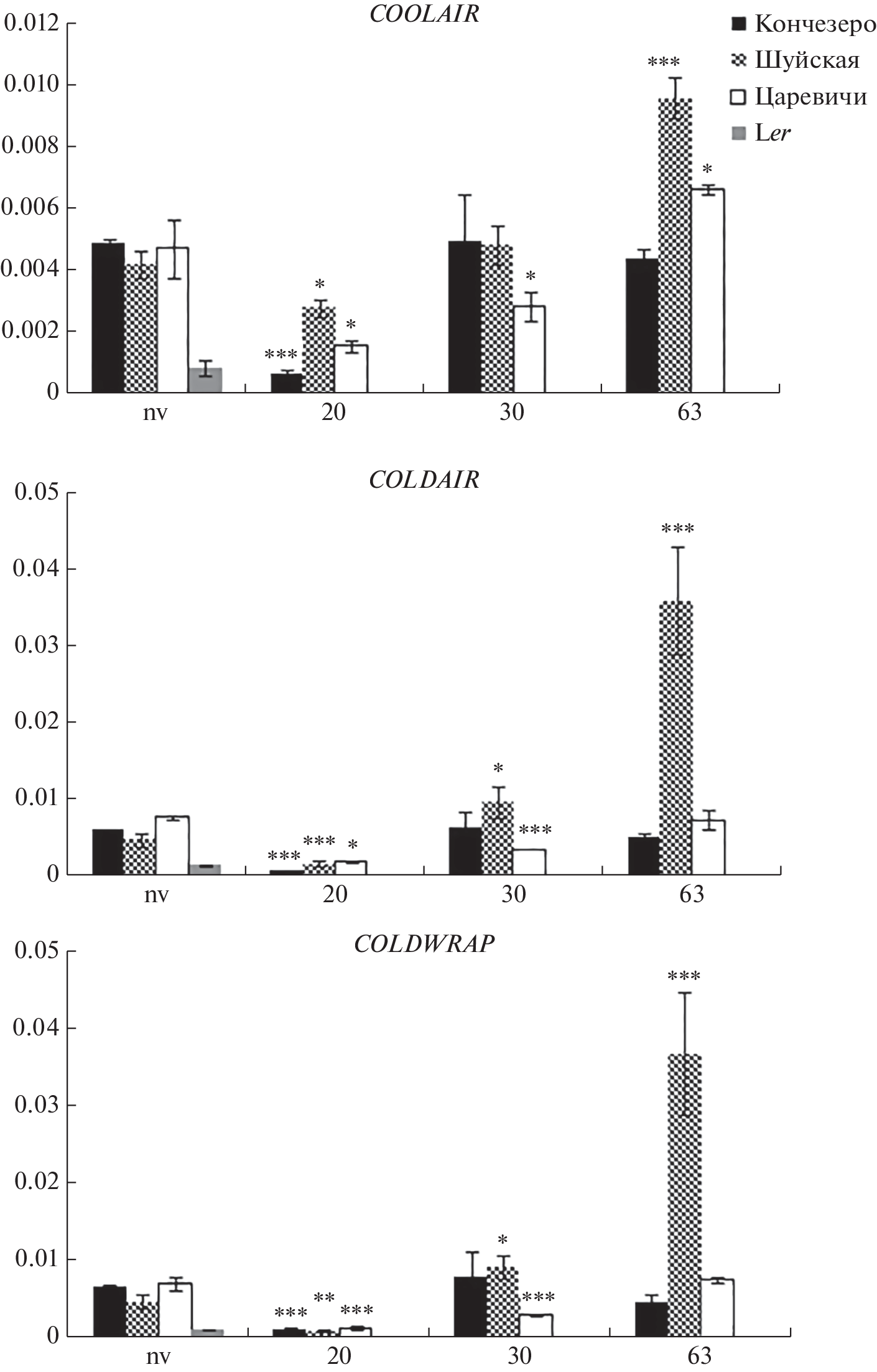 Peculiarities of the lncRNA expression – COOLAIR, COLDAIR, and COLDWRAP, which perform an important function in the vernalization-mediated epigenetic mechanism of the transition to flowering in A. thaliana plants of northern natural populations (Karelia), were revealed. The results obtained are partly differ from the data of other authors performing studies on pure lines and other ecotypes of this species. It is suggested that the genetic and epigenetic mechanisms involved in the process of vernalization and control of flowering times may differ in plant populations from different geographic regions.