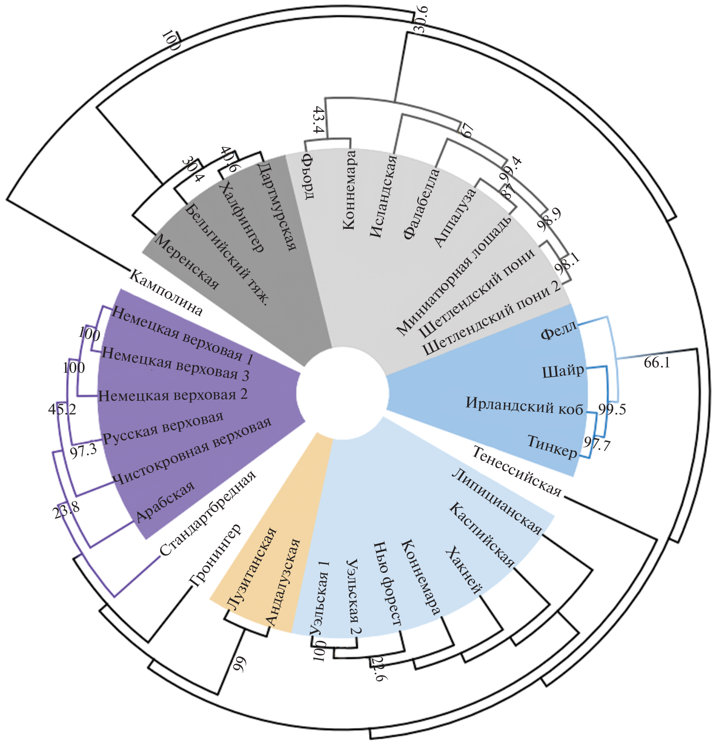 166 horses of the russian riding breed were studied using 17 microsatellite loci recommended by ISAG. Microsatellite polymorphism data of thirty European breeds (7874 individuals) was used for comparative analysis of genetic diversity. According to the level of allelic richness, the Russian riding horse has high values – 5. 4 alleles per microsatellite locus. In total, 122 alleles were found in the breed, including private 14 allele at the HTG7 locus. The population genetic structure was revealed for the Russian riding, Arabian, Akhal-Teke, German riding and thoroughbred breeds. Clustering of horse breeds on a circular UPGMA dendrogram revealed six main clusters. the Russian ridinghorse forms a single group with German and thoroughbred horses in PCA. Breeds were divided into three populations in STRUCTURE program: 1) Arabian, 2) Russian Riding, Akhal-Teke, thoroughbred riding, 3) German half-breed. Analysis of differentiation between breeds using the F-st method showed the greatest values (differences) between all breeds with the Akhal-Tekehorses. The smallest value (Fst = 0.22) between the Russian riding and German riding breed. Differences for each pair of breeds were significant (p-value < 0.001).