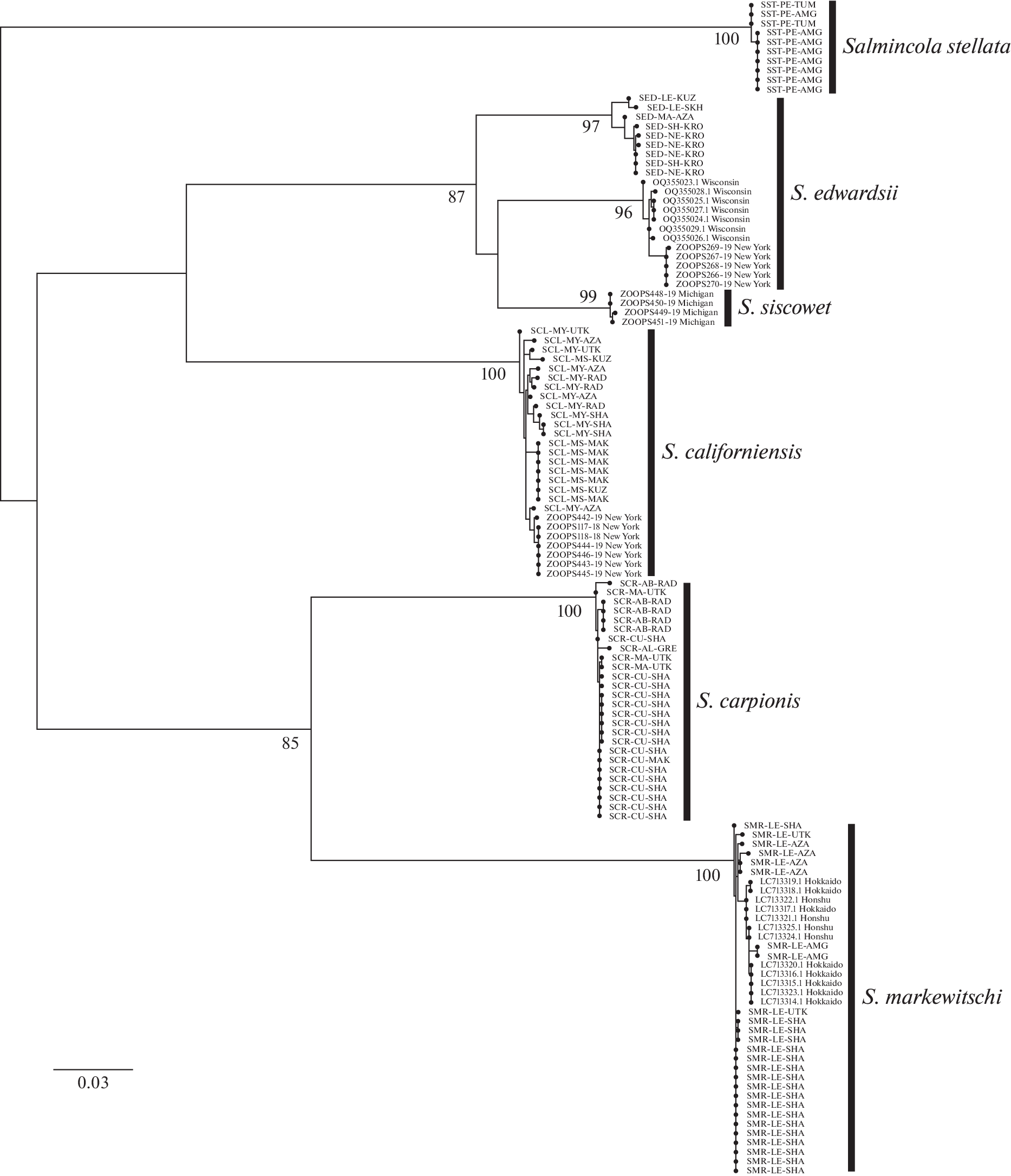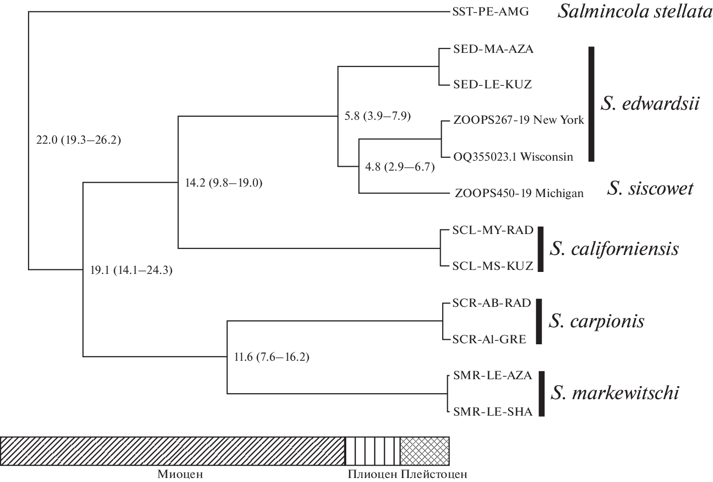 The barcode fragment of the COI gene was sequenced in 91 specimens of five species of parasitic Salmincola copepods, sampled from salmonids mainly from the Russian Far East: S. californiensis (mykiss and masu salmon) and S. edwardsii (various species of chars, sockeye salmon from Lake Kronotskoe), S. carpionis (various species of chars), S. markewitschi (whitespotted char), S. stellata (Sakhalin taimen). A total of 41 haplotypes were found with a maximum level of differences of 0.183 nucleotide substitutions per position. The distance between species varied from 0.139 ± 0.014 in the S. markewitschi–S. carpionis pair to 0.179 ± 0.015 in the S. stellata–S. californiensis pair. The intraspecific nucleotide diversity of the COI gene fragment is much lower: for S. californiensis and S. edwardsii, inhabiting the gill cavity and fins of the host – 0.013 ± 0.003 and 0.015 ± 0.003, and for S. stellata, S. markewitschi, and S. carpionis, localized in the buccal cavity of the hosts – 0.002 ± 0.001, 0.004 ± 0.001, and 0.005 ± 0.001, respectively. A comparison of samples of three Salmincola copepod species from different regions of the Russian Far East revealed a significant (Fst = 0.28–0.42, P \( \ll \) 0.001) genetic subdivision. Three subclades of edwardsii-like copepods – S. edwardsii from the Russian Far East, S. edwardsii from the American brook char of eastern North America, and S. siscowet from the lake char of Michigan (COI sequences of copepods from the last two groups are taken from genetic databases) – differed from each other by an average of 9.3–10.9% nucleotide positions, which means the need for a taxonomic revision of S. edwardsii. According to the molecular dating carried out, the divergence of Salmincola lineages started in the Miocene and ended in the early Pliocene. The phylogenetic substitution rate was 0.0228 (95% interval: 0.0132–0.033) nucleotide substitutions/position/million years/lineage. The rate of nucleotide substitutions at the population level is 3.7 times higher – 0.0849 (0.0212–0.170). The high level of variability of the COI gene fragment makes this marker a useful tool both for developing the taxonomy and phylogeny of Salmincola and Lernaeopodidae copepods at the species and genus levels, and for analyzing the differentiation of their populations.