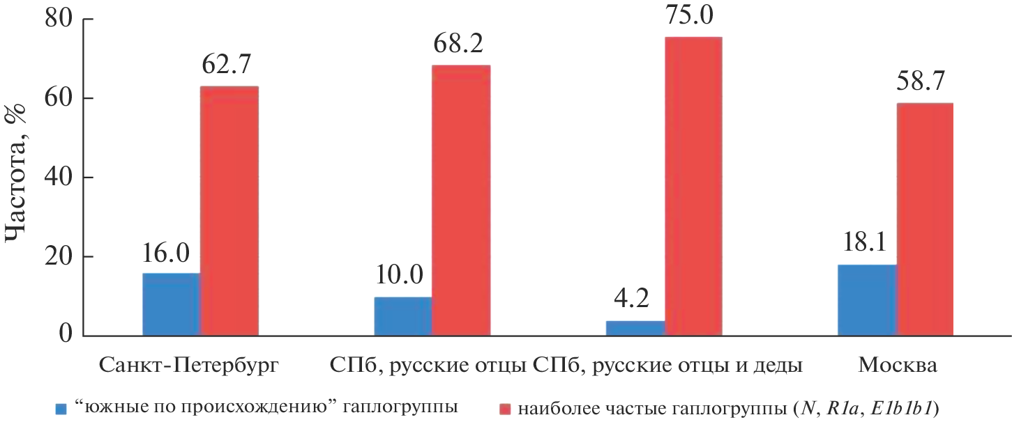 In the sample of male residents of St. Petersburg, Y-chromosome haplogroups were determined by genotyping 18 STR Y-chromosome (DYS389I, DYS389II, DYS390, DYS19, DYS385A, DYS385B, DYS456, DYS437, DYS438, DYS447, DYS448, DYS449, DYS391, DYS392, DYS393, DYS439, DYS635 and DYS576) and data on genetic demography were collected by means of a questionnaire. The distribution of Y-chromosome haplogroups in St. Petersburg residents generally corresponds to the published data on Russian gene pool, with the most frequent haplogroups R1a, R1b, E1b1b1, N, T, I1, I2, J1 and J2, and with the predominance of haplogroup R1a. The presence of “southern by origin” haplogroups (C3, G2a, G2c, J1, J2, L, O2, O3, Q, R2 and T) entering the megalopolis with a flow of migrants, with a total frequency of 16% (in Moscow – 18.1%) was noted. A comparative analysis of the frequency distributions of Y-chromosome haplogroups in residents of St. Petersburg and Moscow revealed statistically significant differences in the frequency of haplogroup E1b1b1, and differences in the ratio of I1 and I2, determined by geographic position. Based on the survey data, a sample of Russian men who had no ancestors of another ethnicity in the male line in the two previous generations was formed. Significant differences in the frequency of “southern-origin” haplogroups were established between the initial sample of residents of St. Petersburg (16%) and the sample of men with Russian ancestors in two previous generations (4.1%). The obtained result confirms the spectrum of haplogroups of “southern origin” as penetrating into the gene pool of the population of a megalopolis with migrant flows and indicates the need for genetic and demographic questionnaires when forming reference databases for a megalopolis, as well as for their timely updating due to changes in the gene pool under the influence of migration.