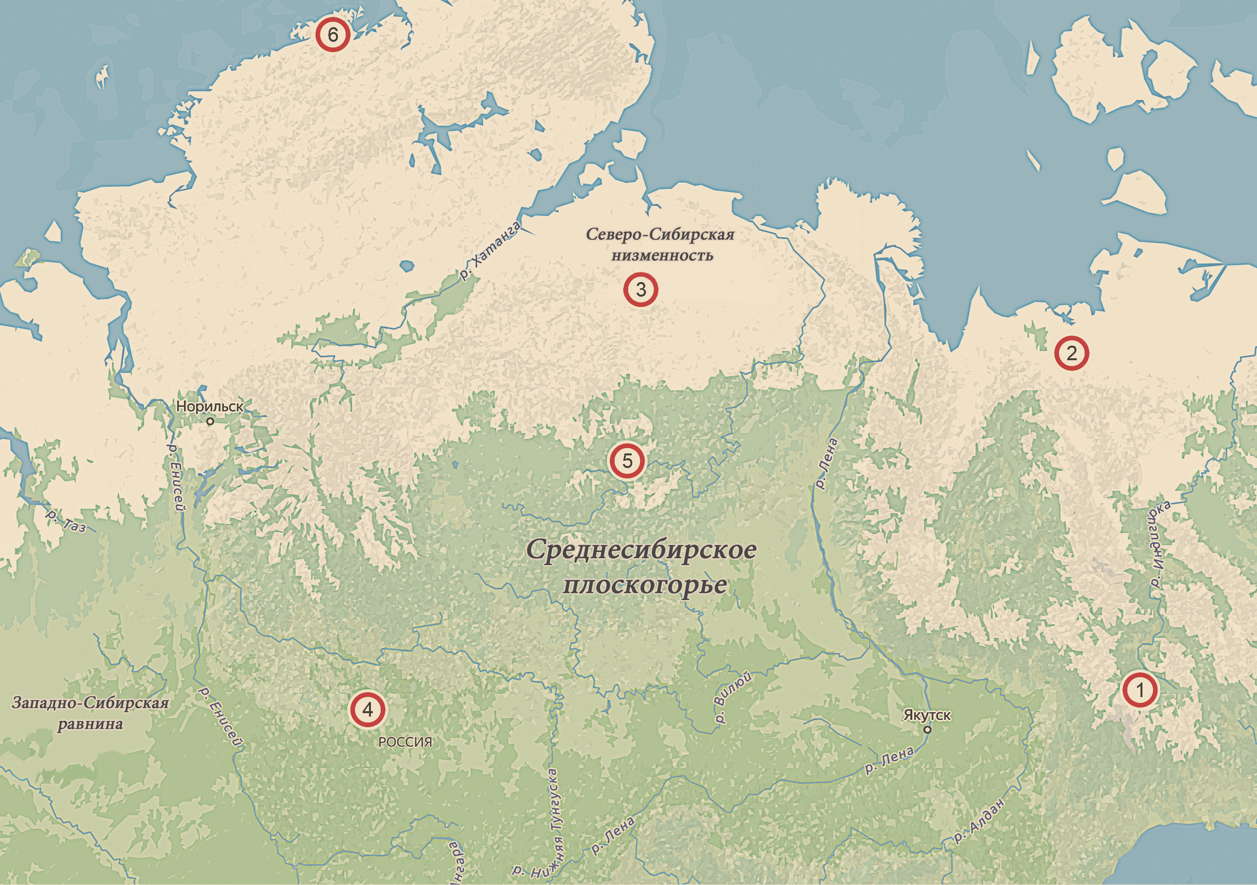 Рис. 1. Карта выборок из популяций доместицированных и диких оленей. 1 – “Ючюгейское”, 2 – “Таба-Яна”, 3 – “Анабар”, 4 – “Суриндинский”, 5 – “Оленёк”, 6 – “Таймыр”.