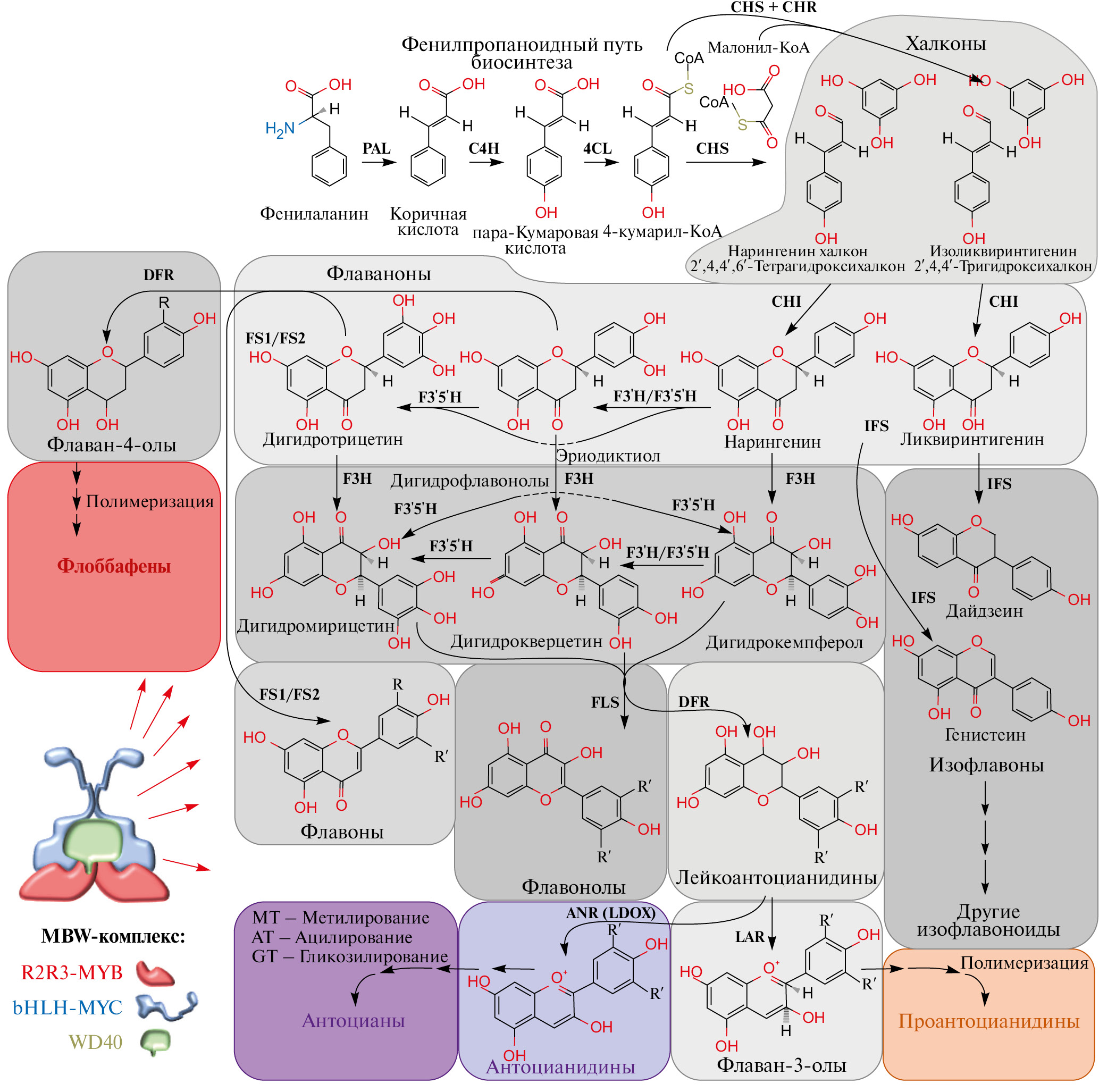 Рис. 1. Схема пути биосинтеза флавоноидов у растений. Классы неокрашенных флавоноидов выделены оттенками серого цвета, окрашенные флавоноиды (флобафены, проантоцианидины, антоцианидины и антоцианы) выделены цветами. Путь биосинтеза флавоноидов у растений начинается, как и у всех фенольных соединений, с последовательных превращений фенилаланина, катализируемых фенилаланинаммиаклиазой (PAL, phenylalanine ammonia-lyase), 4-гидроксилазой коричной кислоты (C4H, cinnamic acid 4-hydroxylase) и 4-кумарат-КоА-лигазой (4CL, 4-Coumarate-CoA ligase). Халконсинтаза (CHS, chalcone synthase) опосредует синтез нарингенин-халкона – предшественника большинства флавоноидов, а совместное действие халконсинтазы и халконредуктазы (CHR, chalcone reductase) обусловливает синтез халкона-предшественника изофлавоноидов изоликвиринтигенина. Халконы дают начало всем классам флавоноидов, что обусловливается работой следующих ферментов: халконизомеразы (CHI, chalcone isomerase), флавонсинтаз 1 и 2 (flavone synthase 1 and 2), изофлавонсинтазы (IFS, isoflavone synthase), флаванон-3-гидроксилазы (F3H, flavanone-3-hydroxylase), флавоноид-3′- и –3′5′-гидроксилаз (F3′H / F3′5′H, flavonoid-3′- / 3′5′-hydroxylase), флавонолсинтазы (FLS, flavonol synthase), дигидрофлавонолредуктазы (DFR, dihydroflavonol reductase), лейкоантоцианидинредуктазы (LAR, leucoanthocyanidin reductase) и антоцианидинредуктазы/ лейкоантоцианидиндиоксигеназы (ANR, anthocyanidin reductase / LDOX, leucoanthocyanidin dioxygenase). Антоцианы синтезируются посредством модификации антоцианидинов посредством метилтрансфераз (MT, methyltransferase), ацилтрансфераз (AT, acyltransferase) и гликозилтрансфераз (GT, glycosyltransferase). Флаваноны и дигидрофлавонолы могут иметь разное количество гидроксильных групп, что опосредуется работой флавоноид-3′- и -3′5′-гидроксилаз и впоследствии приводит к синтезу различных флобафенов, флавонов, флавонолов, проантоцианидинов и антоцианидинов. Так, цианидин характеризуется наличием гидроксильной группы в 3′-положении, а дельфинидин – и в 3′-, и в 5′-положении. Экспрессия различных структурных генов биосинтеза флавоноидов напрямую активируется посредством связывания с их промоторами MBW-комплексов, состоящих из двух димеризованных молекул транскрипционного фактора bHLH-MYC, связанных каждая с одной молекулой транскрипционного фактора R2R3-MYB. Такой комплекс стабилизируется белком WD40.