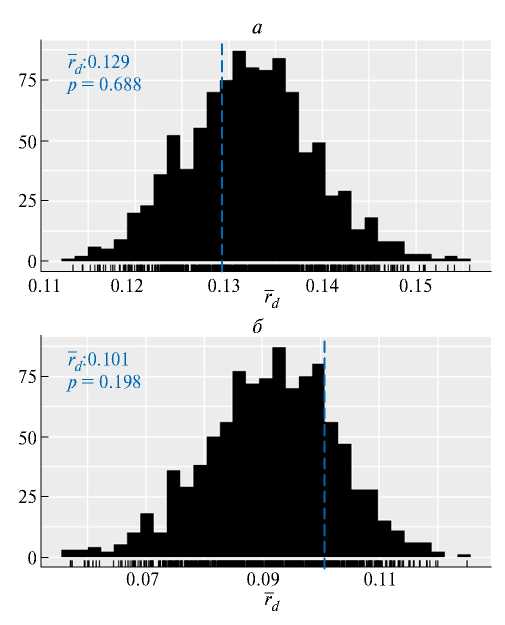 Оценку свободной перекомбинации аллелей в пределах подвидов D. raddei проводили с помощью стандартизированного индекса ассоциаций (). Значение () равное 0.13 (p = 0.018) для вида D. raddei в целом (т.е. для обоих подвидов) указывает на незначительную вероятность перекомбинации аллелей между подвидами (рис. 4,а), т.е. данные подвиды изолированы и скрещивание между их особями отсутствует. Значение индекса ассоциации для подвида D. r. raddei (рис. 4,б) составляет 0.145 (p = 0.008), а для подвида D. r. nairensis – 0.106 (p = 0.001) (рис. 4,в), что может свидетельствовать о значительной обособленности популяций в пределах каждого подвида. Анализ значений индекса ассоциаций в пределах групп D. r. raddei GG и D. r. raddei TT (рис. 5,а и 5,б соответственно) показал высокую вероятность свободного скрещивания между особями популяций внутри каждой группы.