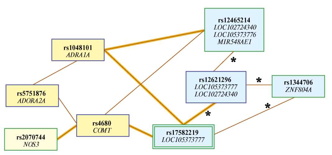 Рис. 1. Схематическое изображение биаллельных сочетаний полиморфных участков различных генов, ассоциированных с ВВО. Каждое сочетание изображено в виде пары SNP как прямоугольники, соединенные оранжевыми линиями; тройные линии связывают компоненты эпистатических сочетаний, одинарные линии – компоненты сочетаний, эпистаза между которыми не обнаружено. Звездочка около линии означает, что сочетание описано в работе [11]. Желтые прямоугольники – SNP в генах, продукты которых участвуют в нейрогуморальной регуляции (группа 1), голубые – SNP, расположенные на хромосоме 2 в локусе 2q32.1 (группа 2). В зеленой рамке – SNP, ассоциация которых с ВВО была показана только в составе сочетаний, в синей рамке – еще и в одиночку.