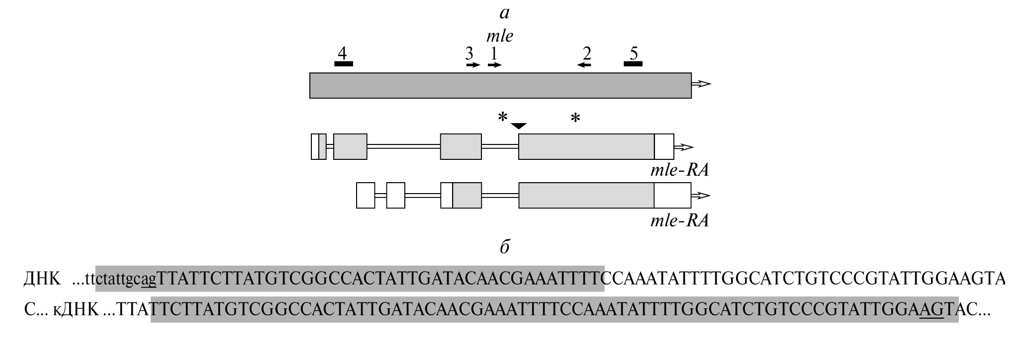 Рис. 1. Молекулярное картирование мутации mle[9] на уровне ДНК и мРНК. а – схематическое изображение гена mle и его транскриптов. mle-RA – транскрипт, кодирующий полноразмерный белок; mle-RC – гипотетический транскрипт. Звездочками обозначены сайты эндонуклеазы рестрикции HincII; стрелками обозначено положение зондов 1, 2 и 3, использованных для картирования делеции; черным треугольником – установленное нами точное положение делеции. Черные отрезки указывают положение зондов для измерения уровня транскрипции mle “выше” (4) и “ниже” (5) делеции; б – фрагмент нуклеотидной последовательности в районе делеции mle[9] в ДНК и кДНК. В ДНК строчными буквами обозначена последовательность интрона, прописными буквами – экзона; последовательность, делетированная в мутации mle[9], выделена серым цветом, подчеркнуты динуклеотиды AG – акцепторные сайты сплайсинга в гене дикого типа и в мутации.