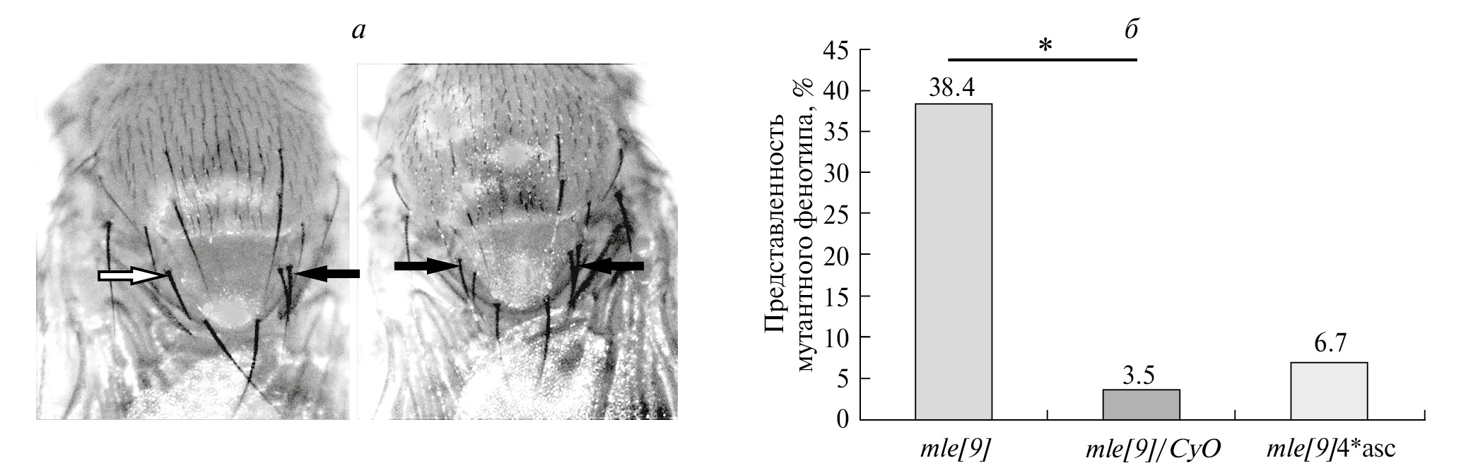 Рис. 6. Мутация mle[9] влияет на формирование скутеллярных макрохет (asc). а – удвоение передней скутеллярной макрохеты с одной (слева) или с обеих (справа) сторон груди у гомозиготных самок. Белой стрелкой обозначено нормальное расположение макрохет, черными стрелками – мутантный фенотип; б – частота встречаемости мутантного фенотипа у гомо- (mle[9]) и гетерозиготных (mle[9]/CyO) самок; 4*asc – самки с удвоением макрохет с обеих сторон, * p < 0.001.