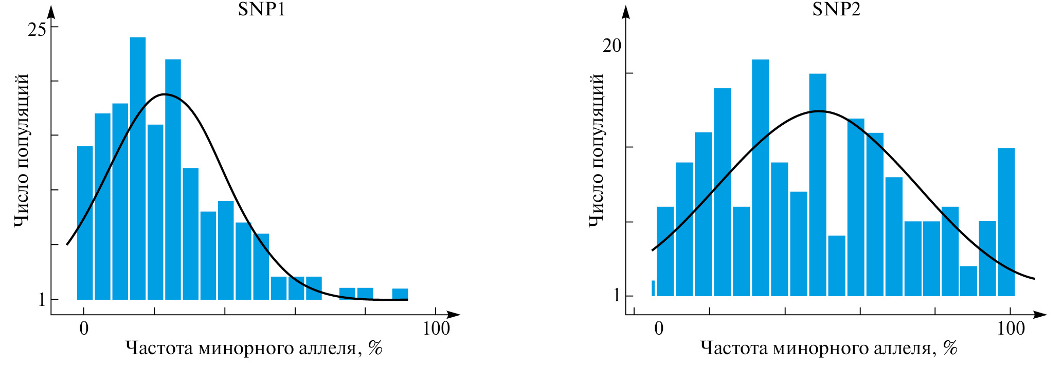 Как видно из гистограммы (рис. 1), распределение аллелей несколько отличается от нормального. SNP2 отличается тенденцией к фиксации крайних вариантов: гомозигот по минорному и мажорному аллелям, а SNP1 демонстрирует смещение распределения в сторону минорного аллеля.