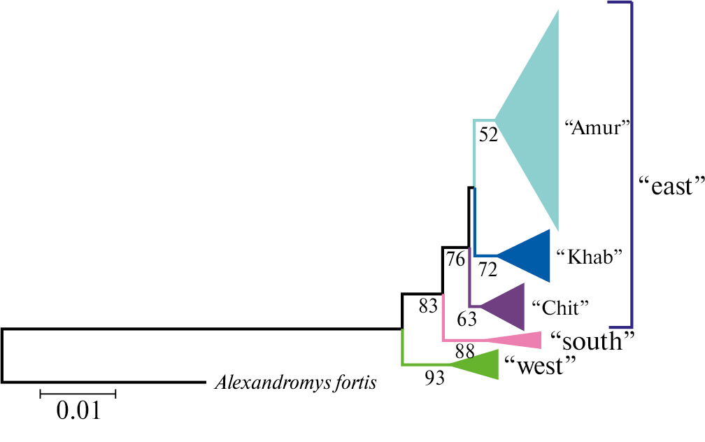 В результате анализа контрольного региона митохондриальной ДНК полевки Максимовича был отмечен высокий уровень генетической изменчивости для вида в целом. При этом каждая отдельная локальная популяция может иметь значительное снижение нуклеотидного разнообразия (более чем в 1.5 раза) [19], что обусловлено особенностью биологии вида. Так, для полевки Максимовича характерны достаточно глубокие депрессии численности, когда вид сохраняется в отдельных небольших удаленных друг от друга колониях. Кроме этого, полевка Максимовича – представитель лесной и лесостепной зоны, предпочитающий влажные биотопы. Распространение вида, прежде всего, приурочено к речным долинам, а преодоление высоких горных хребтов и больших сухих пространств затруднено. Эти особенности биологии наряду с разнообразной и динамической географией района исследования оказали влияние на сложную филогеографическую структурированность и подразделенность вида. Всего для вида выделено три филогенетические группы – “east”, “west” и “south”.