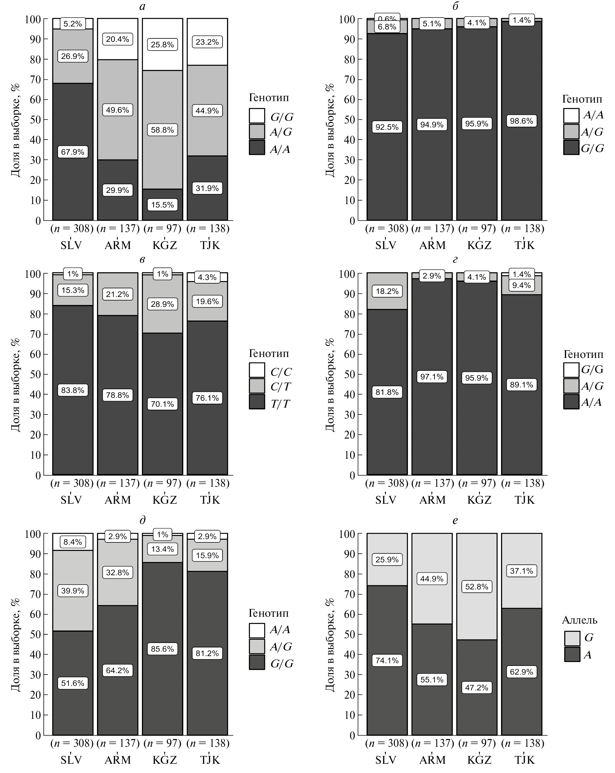 Сравнение выборок из стран ВЕЦА между собой показало, что для полиморфных вариантов гена TLR2 (rs5743708, rs3804100) не характерна популяционная специфичность, и наоборот для rs5743810 TLR6 обнаружены значимые различия (p < 0.05) в частотах генотипов при сравнении выборок SLV/ARM, SLV/KGZ, SLV/TJK, ARM/KGZ и ARM/TJK (рис. 1). При этом имеющие сходные частоты генотипов rs5743810 TLR6 выборки KGZ и TJK значимо различались при сравнении частот генотипов rs5743551 TLR1 и аллелей rs3764880 TLR8. Последнее, впрочем, может быть объяснено тем, что в выборке TJK женщин в 3.76 раз меньше чем мужчин, а в выборке KGZ это соотношение составляет 2.23. Для восточнославянской выборки SLV обнаружены наибольшие отличия от остальных выборок по частотам генотипов rs5743551 TLR1, rs4986790 TLR4, rs5743810 TLR6.