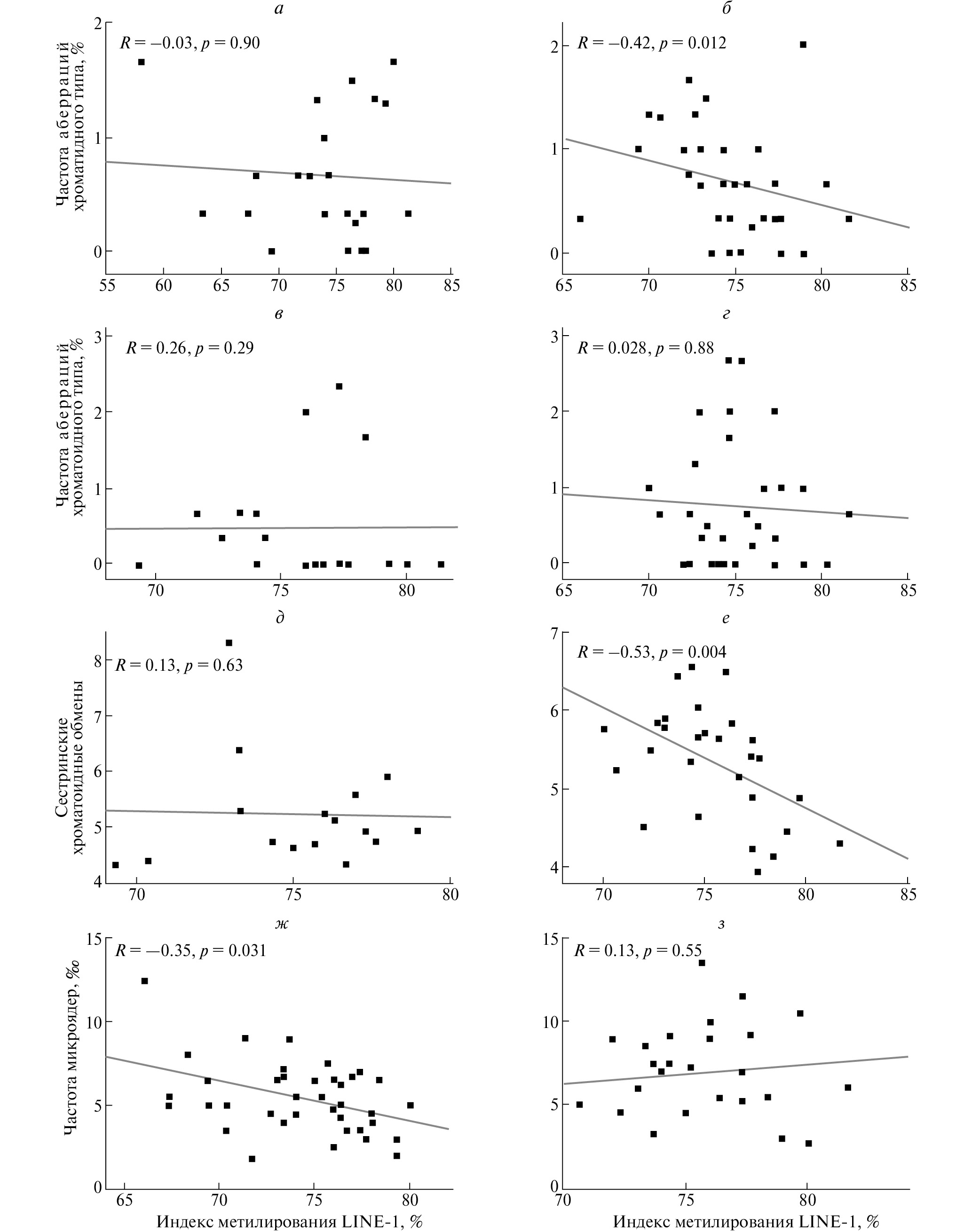 Рис. 1. Корреляции между индексом метилирования LINE-1 и частотами аберраций хроматидного и хромосомного типов, уровнем сестринских хроматидных обменов и частотой микроядер в контрольной группе (а, в, д, ж) и группе работников радиохимического производства (б, г, е, з).