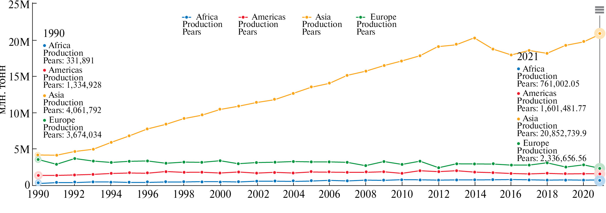 Груша имеет большой потенциал в промышленном производстве. На основании данных ФАО (Продовольственная и сельскохозяйственная Организация Объединенных Наций) можно проследить динамику роста производства груши в мире. За период с 1990 г. по 2021 г. (рис. 1) видны изменения в мировом производстве груши от 9.5 млн тонн (суммарное количество производства груши в 1990 г.) до более чем 22 млн тонн в 2021 г. Также можно отметить, что страны Азии лидируют на протяжении рассматриваемого периода, начиная с производства 4 млн тонн груши (1990 г.) до более чем 20 млн тонн (2021 г.) в год.