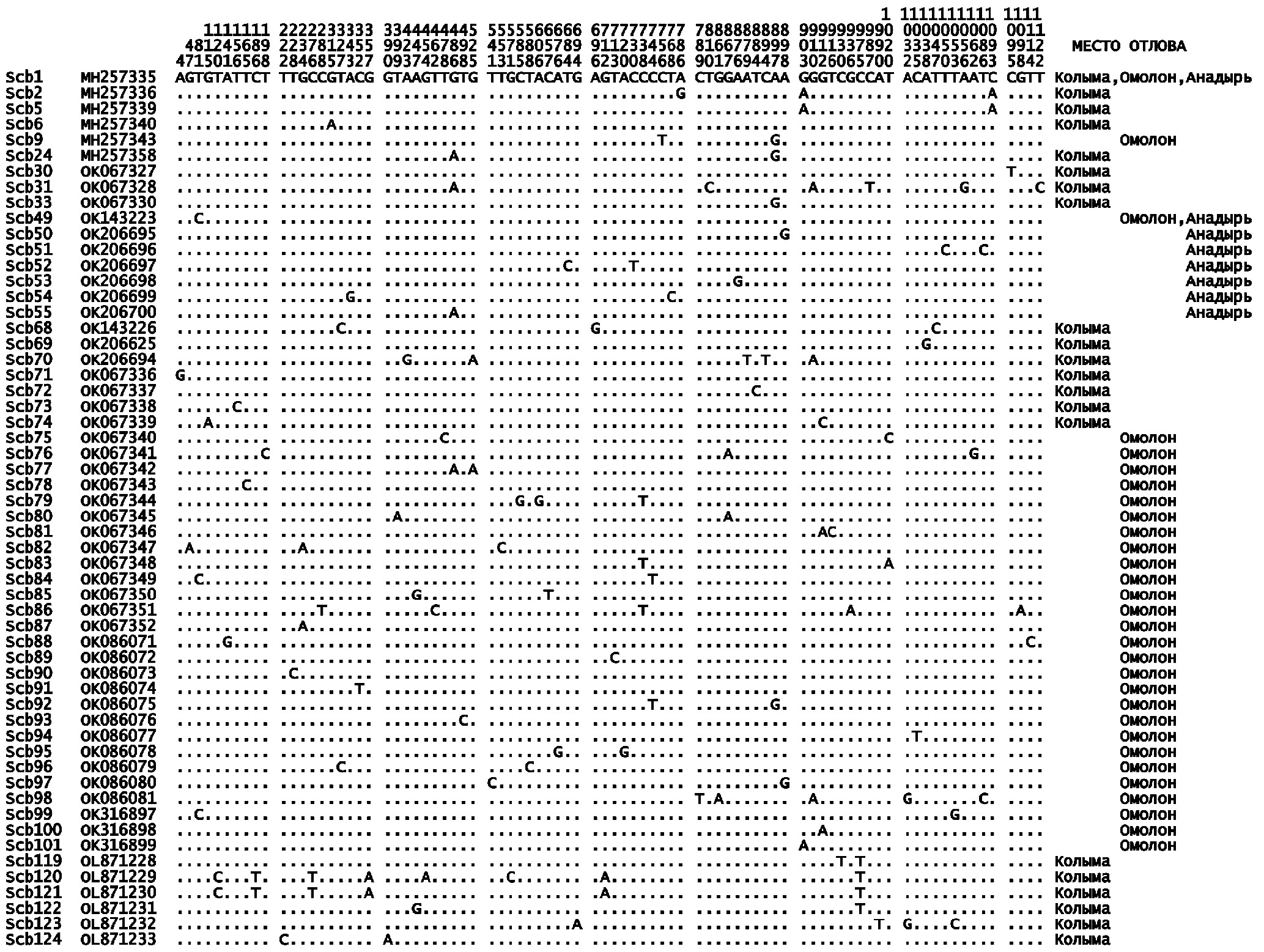 Рис. 2. Гаплотипы гена цитохрома b средней бурозубки S. c. koreni из популяций верховьев Колымы и Чукотки. Нуклеотидные замены представлены относительно последовательности варианта Scb1. Сайты замен показаны от начала гена цитохрома b