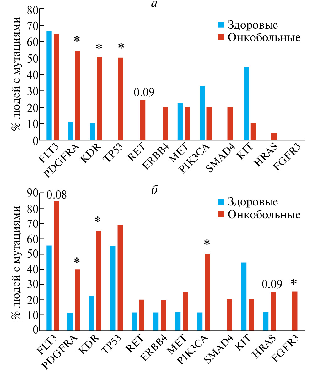 У здоровых людей в крови не было обнаружено мутаций в генах TP53 (tumor protein p53), RET (ret proto-oncogene), ERBB4 (erb-b2 receptor tyrosine kinase 4), SMAD4 (SMAD family member 4), HRAS (HRas proto-oncogene, GTPase), однако они были обнаружены у пациентов с раком легкого (50% для гена TP53, p < 0.05 по χ2 Пирсона; 25% для гена RET, p =0.09 по χ2 Пирсона; 20% для генов ERBB4, SMAD4, различий по χ2 Пирсона не было выявлено; 5% для гена HRAS, различий по χ2 Пирсона не было выявлено) (рис. 1).