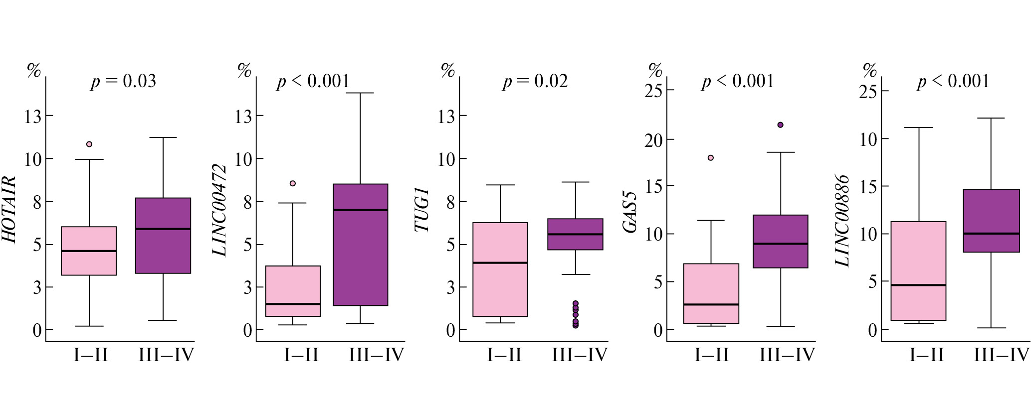 Рис. 2. Повышение уровня метилирования пяти генов днРНК (GAS5, HOTAIR, LINC00472, LINC00886 и TUG1) на более поздних клинических стадиях (III–IV (51 образец) против I–II (42 образца)). На оси абсцисс – стадия заболевания