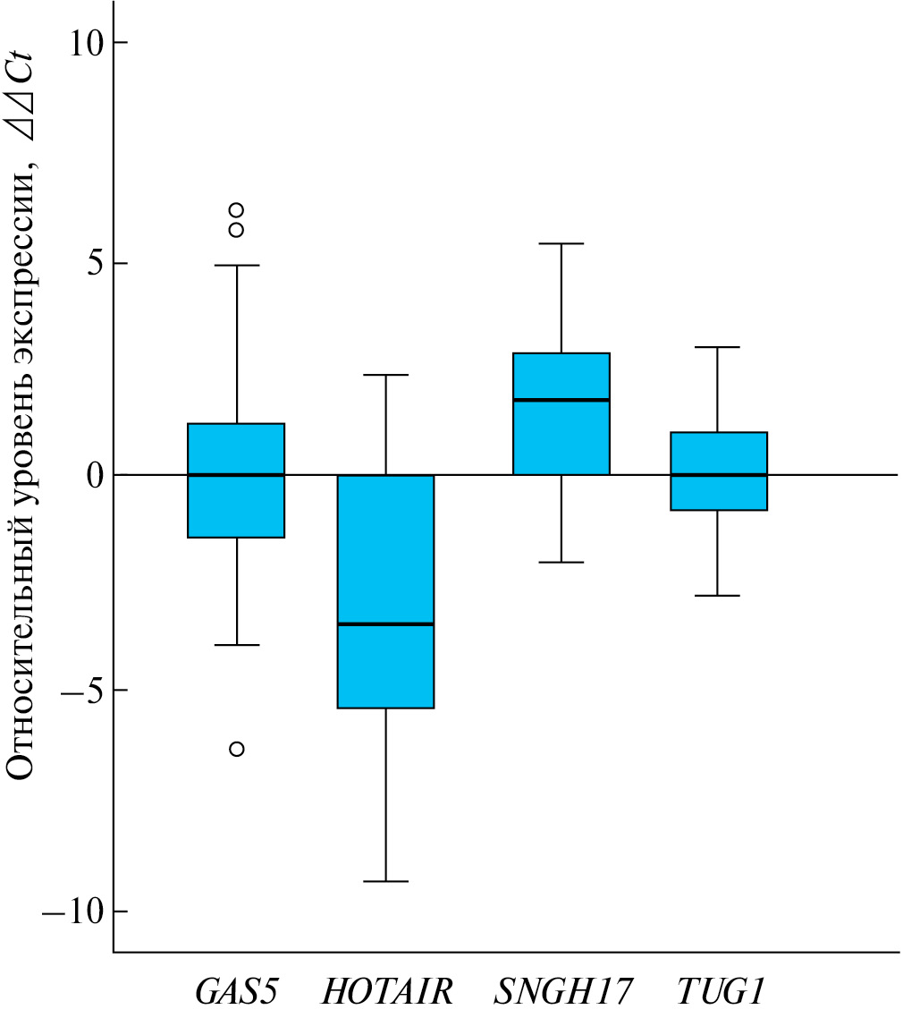 Рис. 4. Профиль изменения уровня экспрессии днРНК GAS5, HOTAIR, SNHG17 и TUG1 на выборке из 36–53 образцов РЯ относительно условной нормы
