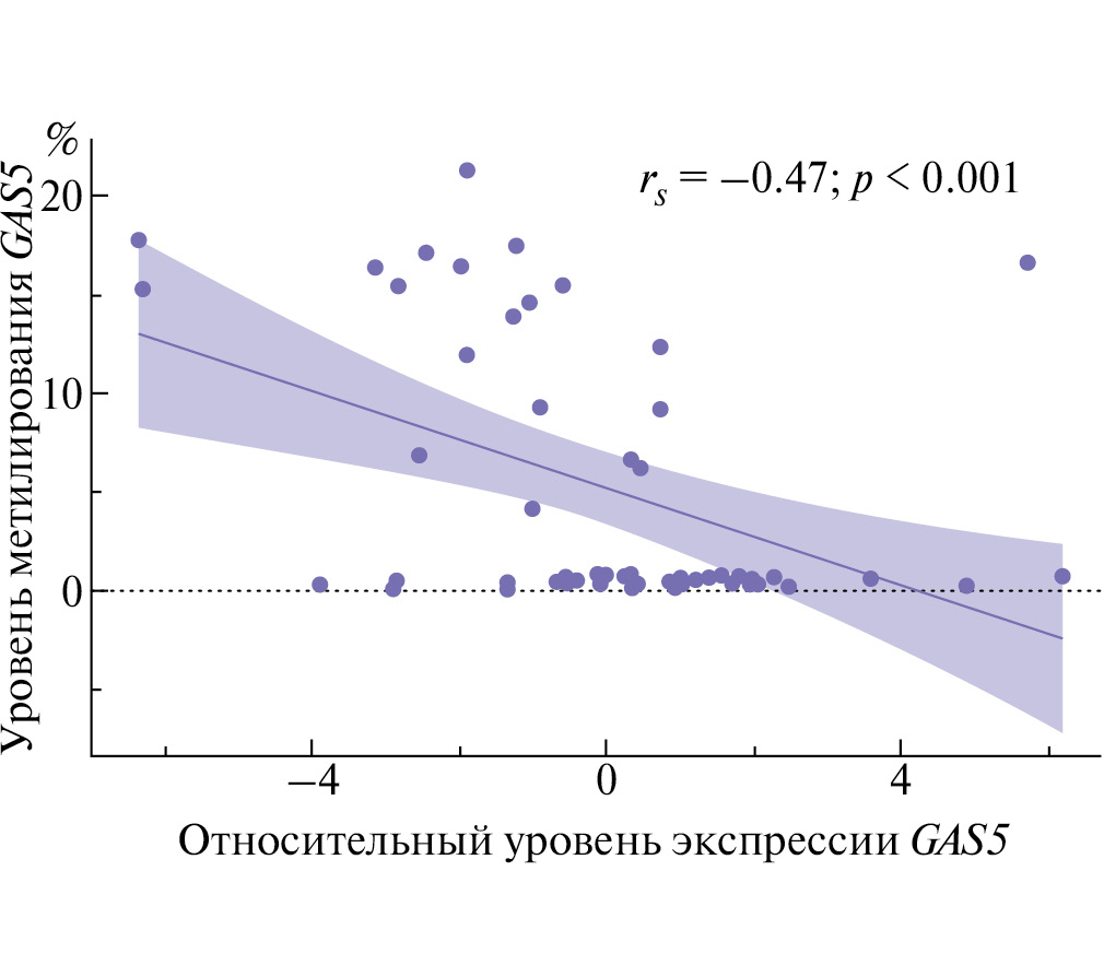 Рис. 5. Отрицательная корреляция между изменениями уровней метилирования и экспрессии гена GAS5 (в 53 парных образцах РЯ); на рисунке приведен коэффициент корреляции Спирмена: rs = −0.47, p < 0.001